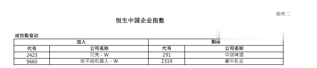 记者注意到,恒生中国企业指数成分股数量维持50只。其中,贝壳-W、地平线机器人-W被纳入恒生中国企业指数;华润啤酒、蒙牛乳业被剔除。