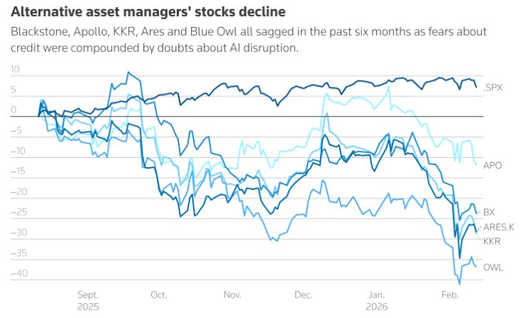 另类资产管理公司主要投资于传统股票和债券市场之外的资产,它们一直未能摆脱去年底以来对私募信贷风险的担忧。如今,尽管数十亿美元的新客户资金涌入,且并购活动复苏(分析师认为这应该会转化为更多收入和利润),但软件股的抛售潮仍然进一步拉低了这些资产管理公司的股价。