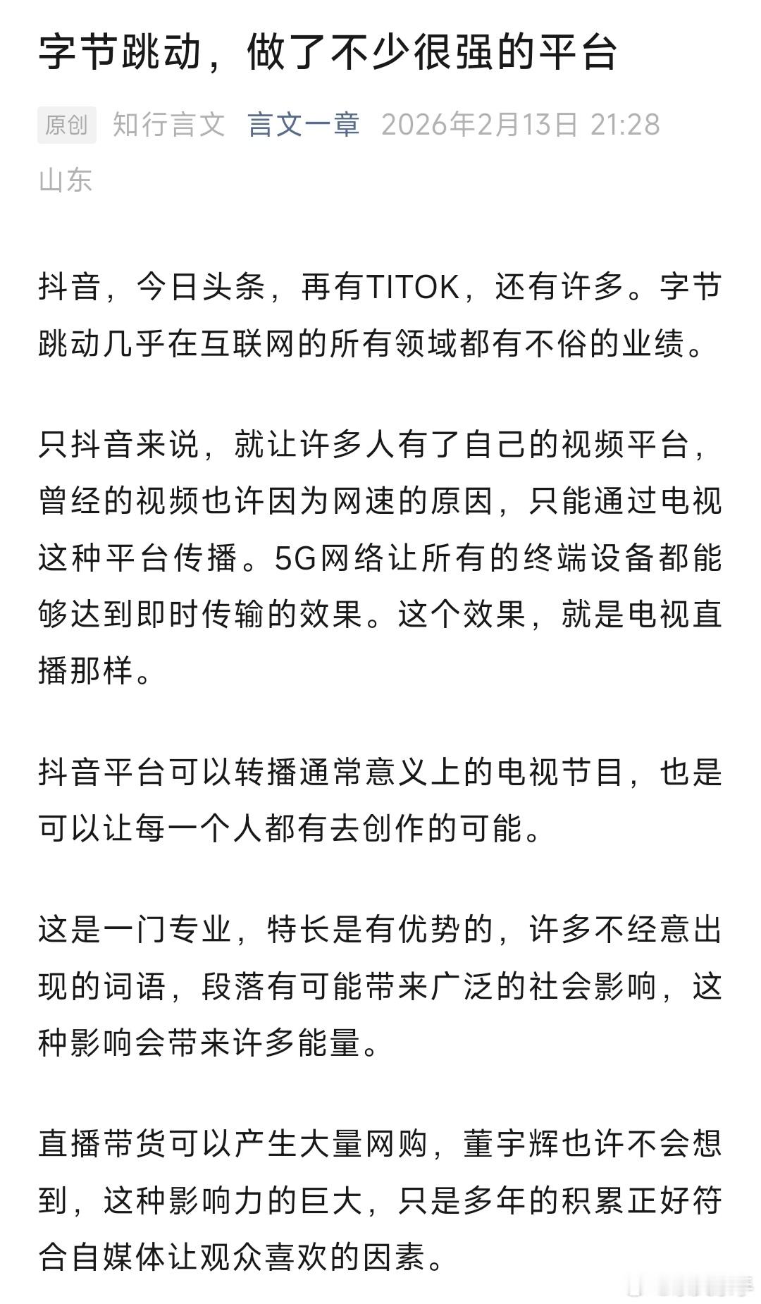 抖音,今日头条,再有TITOK,还有许多。字节跳动几乎在互联网的所有领域都有不俗的业绩。只抖音来说,就让许多人有了自己的视频平台,曾经的视频也许因为网速的原因,只能通过电视这种平台传播。5G网络让所有的终端设备都能够达到即时传输的效果。这个效果,就是电视直播那样。抖音平台可以转播通常意义上的电视节目,也是可以让每一个人都有去创作的可能。这是一门专业,特长是有优势的,许多不经意出现的词语,段落有可能带来广泛的社会影响,这种影响会带来许多能量。直播带货可以产生大量网购,董宇辉也许不会想到,这种影响力的巨大,只是多年的积累正好符合自媒体让观众喜欢的因素。字节跳动中的抖音几乎是目前最有影响力的视频平台,今日头条的新闻也是丰富,有了让用户不断收到感兴趣的算法,会大大提高对于这些软件的使用频率。这个使用频率对于字节跳动来说,就是追求的指标。指标这么高,利润自然可观。对比其他的网络软件,也会有相似的功能设置,在市场竞争中这是必然,已有的成功经验是要借鉴的。字节跳动的发展快,据说从资本市场来看,几乎是能够与其他几家网络大公司的总和做对手。一方面是自己有投资的部分,还有是投资人的看好,让字节跳动更加突出。信息技术的发达,再有算法的突出,让字节跳动有了目前的状态。