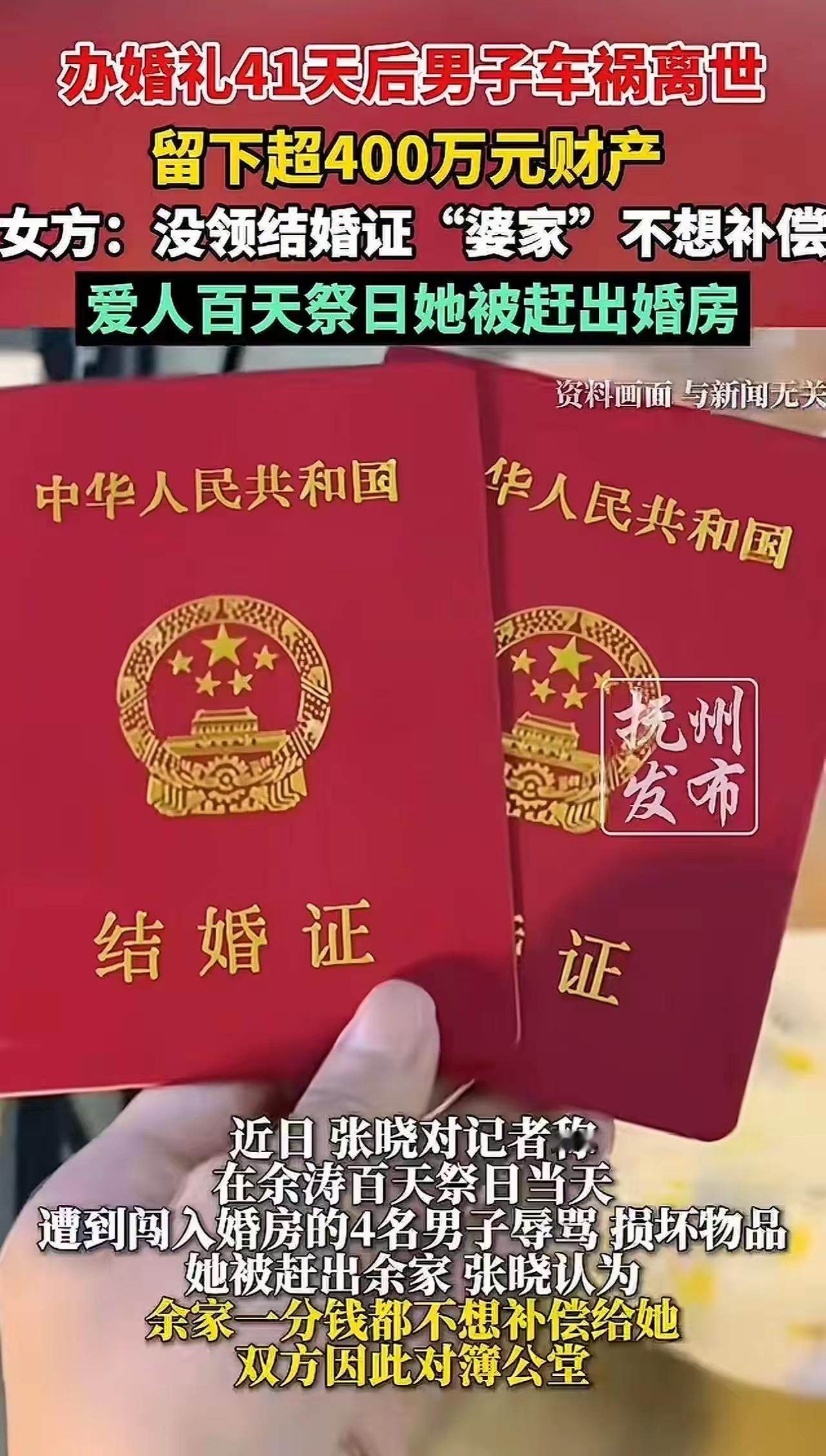 她为他披麻戴孝,却败给了一张纸——婚姻里,最冷的从来不是人心,是规则 山西朔州,一场葬礼,两个女人,400万遗产。 31岁的林晓芸(化名)跪在灵堂前,一身粗布孝服,哭得肝肠寸断。她手里紧紧攥着丈夫的遗像,指甲几乎嵌进木头里。 41天前,她还在洞房花烛夜。 41天后,她连"妻子"这个身份,都要靠别人施舍。 "没领证,就不是夫妻。" 婆婆坐在太师椅上,面无表情地吐出这句话。身后站着三个律师,手里是盖着红章的公证书——400万赔偿金和房产,全部归男方父母所有。 林晓芸愣住了。 她想起那个雨夜,丈夫出车祸前一小时,还在电话里说:"老婆,明天就去把证领了,我要给你个名分。" 名分? 她为他端过灵,抱过骨灰盒,打过砂锅(当地习俗,妻子为丈夫送终的仪式),在所有人眼里,她就是王家明媒正娶的媳妇。 可在法律眼里,她什么都不是。 "我们摆了酒,拜了堂,同了房,这不算夫妻算什么?" 林晓芸声音嘶哑。 婆婆冷笑:"摆酒?那是你们年轻人的过家家。没那张结婚证,你就是个外人。" 外人。 这个词像刀子一样捅进心窝。 林晓芸突然意识到,这41天里,她叫过无数次的"妈",在这个女人眼里,从来都只是客气话。 更讽刺的是—— 如果丈夫晚死一天,他们就领证了。 如果车祸早发生一小时,他们甚至还没发生关系。 命运就卡在这41天的缝隙里,把她从一个"妻子",变成了一个"同居女友"。 法院的判决,冰冷而精确。 根据《民法典》,婚姻关系以登记为成立要件。未办理结婚登记的,应当补办登记,否则按同居关系处理。 同居关系,意味着—— 没有继承权。 没有配偶赔偿金。 没有共同财产分割。 她为他流过泪,为他守过夜,为他披麻戴孝在全村人面前磕头。 最后连一块墓碑上的名字,都不属于她。 但故事到这里,并没有结束。 当我深挖这个案件时,发现了更残酷的真相—— 婆婆早就知道儿子要去领证。 车祸当天,是婆婆以"黄道吉日"为由,硬把领证日期推迟了一周。 而那份公证书,是在儿子死后第三天就办好的。 林晓芸还在守灵,婆婆已经在清点家产。 你说这是法律意识强? 还是算计得太精? 网友们吵翻了天—— 有人骂林晓芸:"没领证就同居,活该!现在的年轻人太随便!" 有人骂婆婆:"吃绝户!儿子尸骨未寒就赶人,冷血!" 但更多人,看到了一个更深层的问题—— 我们到底在保护什么? 保护那张纸,还是保护纸背后的人? 保护财产的清晰,还是保护情感的重量? 法律给出了明确的答案:保护规则。 可人心,从来不是非黑即白的。 林晓芸最后拿到了5万块钱。 不是遗产,是"人道主义补偿"。 婆婆说:"看在你伺候我儿子一场的份上。" 伺候。 她用了这个词。 41天的同床共枕,抵不过一张没来得及领的证。 这就是人性吗? 是,也不全是。 这是人性在规则面前的无力,是情感在利益面前的脆弱,是一个女人在最需要保护的时候,发现保护她的那堵墙,恰恰把她挡在了外面。 我不是在鼓吹"先领证后同居"。 我只是突然意识到—— 在这个时代,我们太习惯用"仪式感"代替"契约感"了。 婚礼可以办得很盛大,誓言可以说得很动人,但如果没有那张纸,所有的承诺都停留在道德层面。 而道德,是最靠不住的东西。 它约束不了婆婆的贪婪,也保障不了林晓芸的权益。 所以,如果你正在同居,如果你正在筹备婚礼,如果你也觉得"领证只是个形式"—— 请记住这个故事。 形式,有时候就是全部。 那张纸很薄,薄到可以随手塞进抽屉。 但它也很重,重到能决定你死后,谁来为你流泪,谁来为你争一个名分。 你怎么看? 是林晓芸太傻,还是婆婆太精? 是法律无情,还是人情越界? 评论区说出你的观点