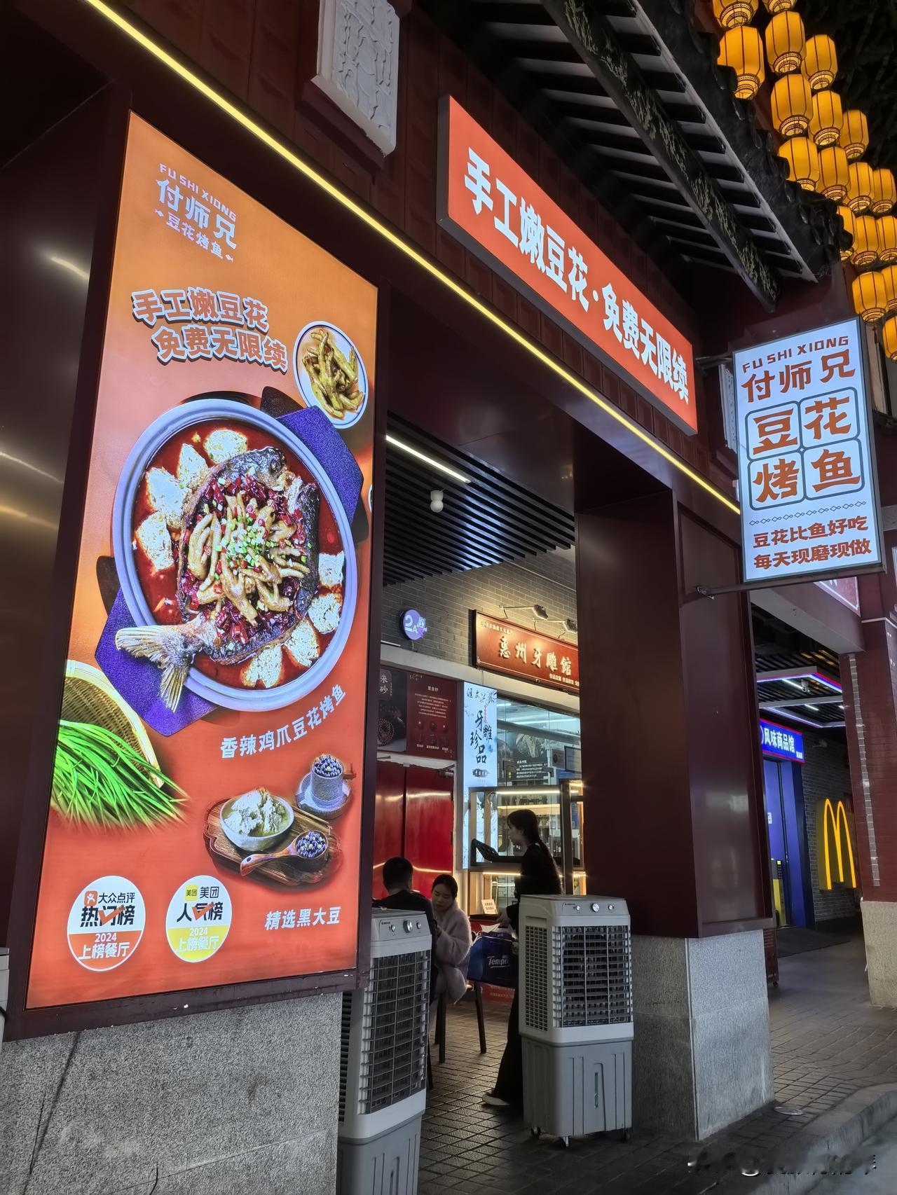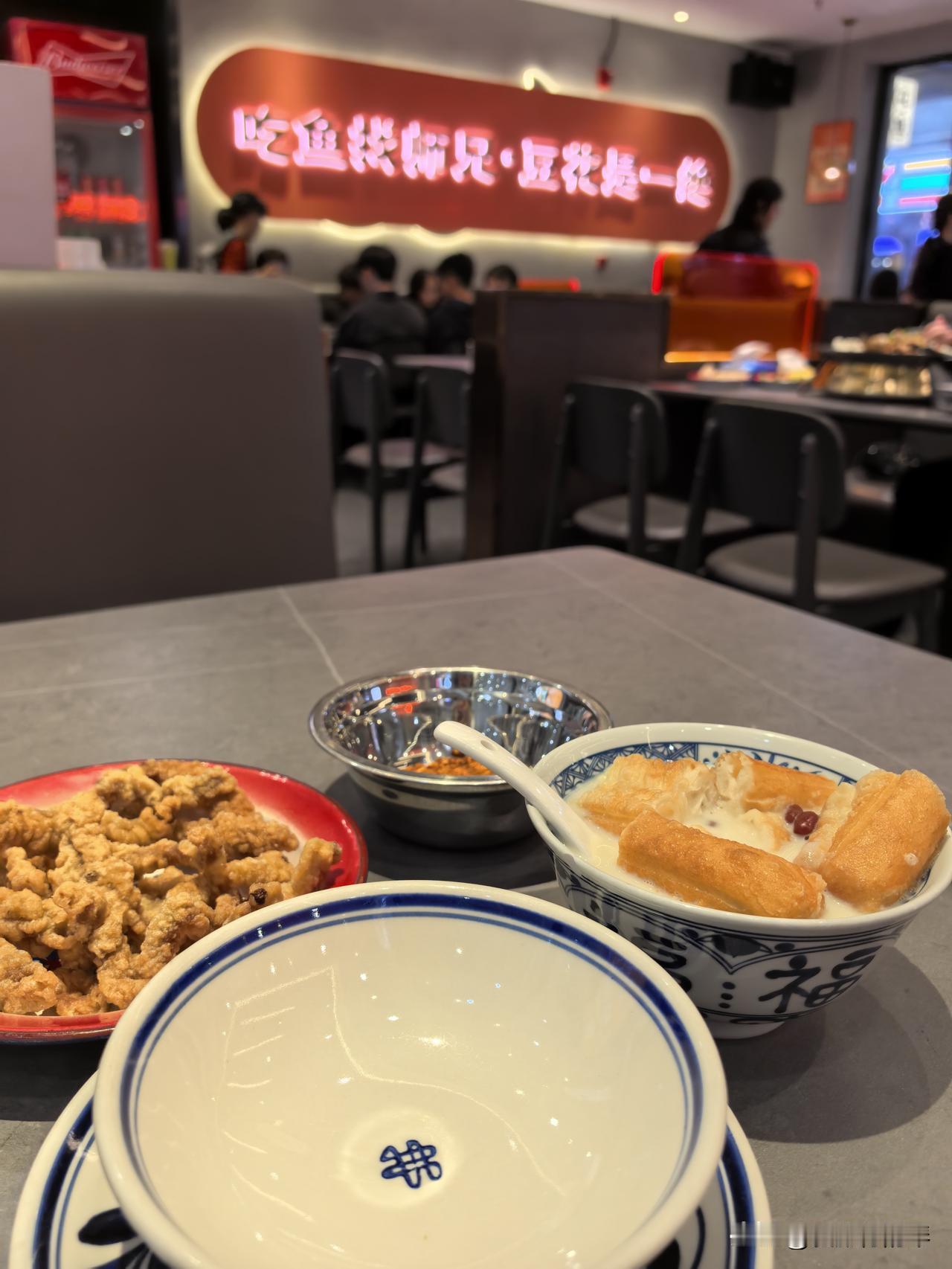年前来水东街逛逛,好热闹,特别是晚上!一进美食街就看到这家豆花烤鱼店,人还挺多,决定尝尝~ 还好我去🉐稍微早点,还有位置,选了个靠窗的座位。不愧是在步行街主干道,还没天黑就满座,不单店内,连店外都坐满了[强][强]出乎我意料之火爆,看见真的要过年咯~~ 不为吃饱,点了份小酥肉和豆浆。酥肉配有辣椒面,对我来说有点辣[捂脸]应该不是现炸的,但是热的,🈶花椒味道(但不重)。相比酥肉,我更喜欢豆浆,料很足,油条、芋圆、汤圆、鸡蛋等,营养丰富。 店里特色是豆花烤鱼,适合多人食用,看这人流量味道想必不错,下次带家人来尝尝!!晒图笔记大赛 惠州美食