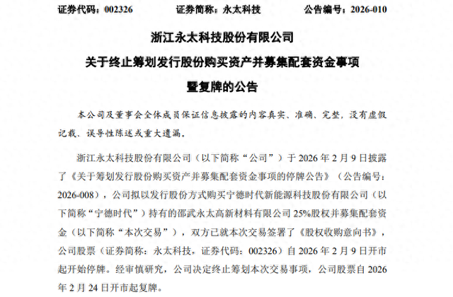 方案推出不到一周,永太科技(002326)2月13日公告,终止收购宁德时代所持子公司股份事项,这也意味着宁德时代反向入股上市公司落空。公司股票自2月24日开市起复牌。