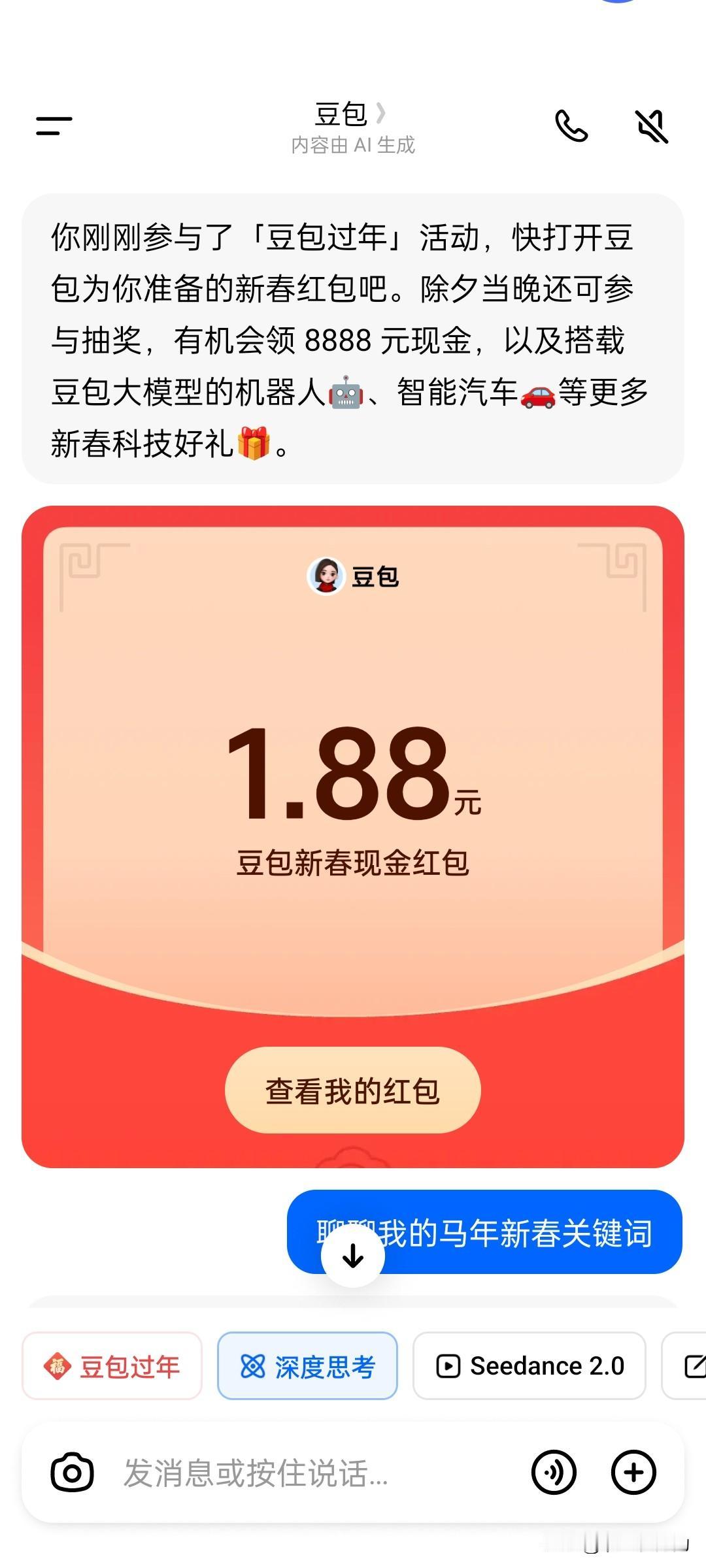 亲测!豆包红包已开领,我抽到了这个数😆 刚亲测豆包新春抽奖,入口就在App左下角「豆包过年」,秒进! 做了个马年AI头像就拿到抽奖机会,中了1.88,提现秒到! 提醒:除夕跟春晚互动还有8888元大奖和海量科技礼 你们都抽到多少了?评论区比一比手气! 豆包 豆包过年 爆料
