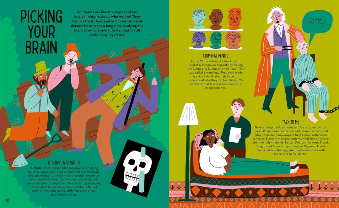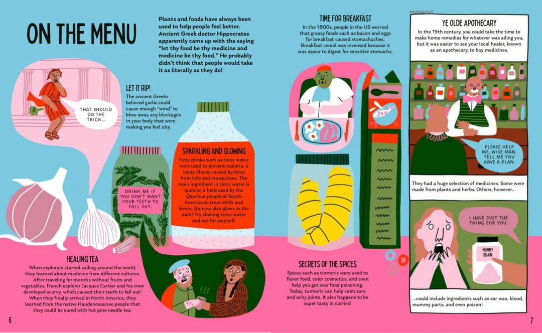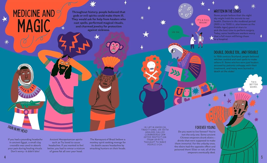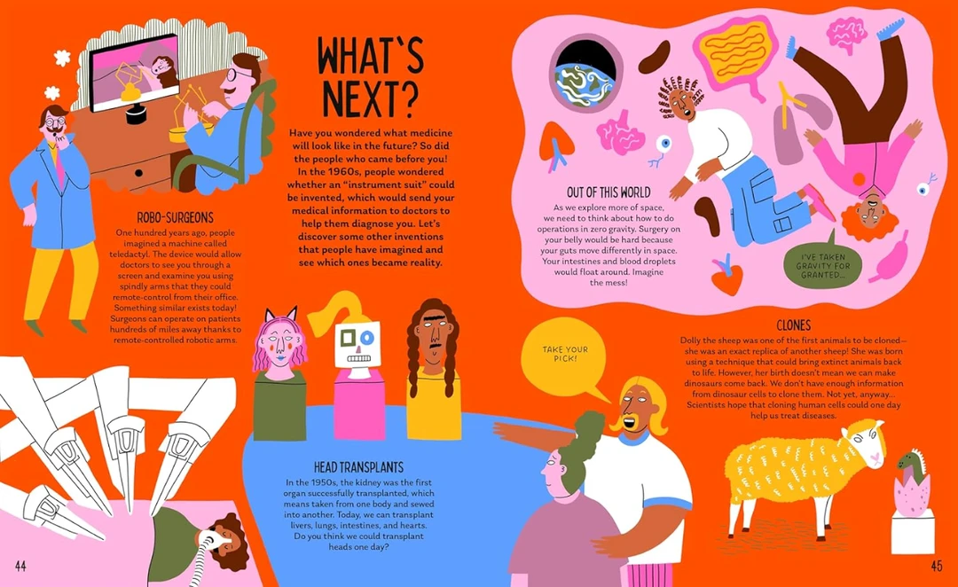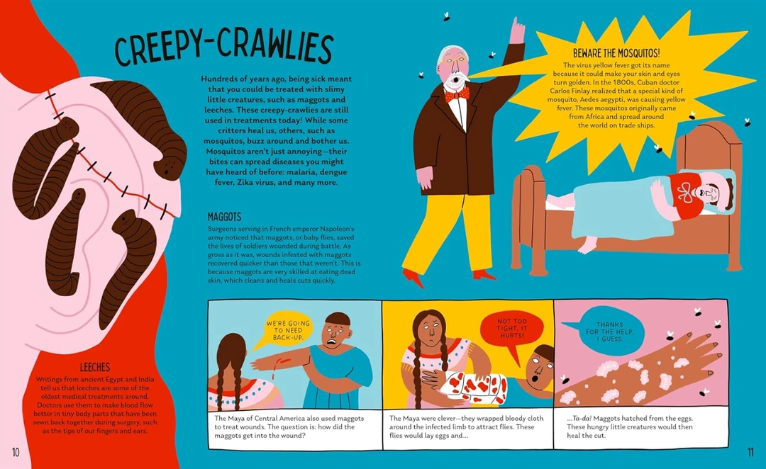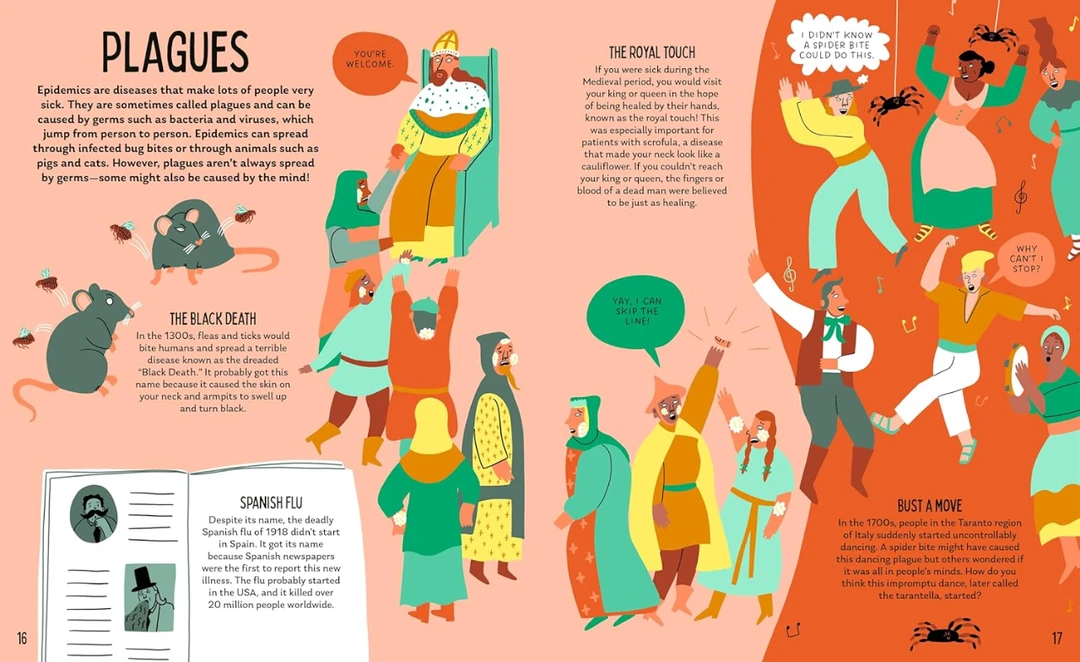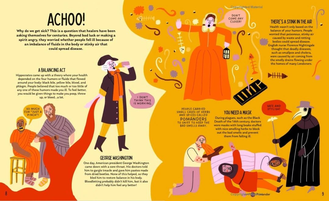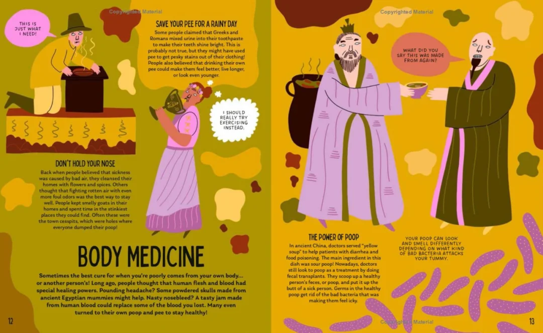 书中以幽默的笔触,带孩子们穿梭世界历史,从古罗马到古代中国,介绍那些突破界限的医学创新者,尽管他们的尝试有时会带来灾难性后果。孩子们能了解到水蛭疗法、蛆虫疗法、Wenyi 中的怪异舞蹈、公开解剖、盗墓、电鳗治疗、牙齿爆炸等奇特医学现象。