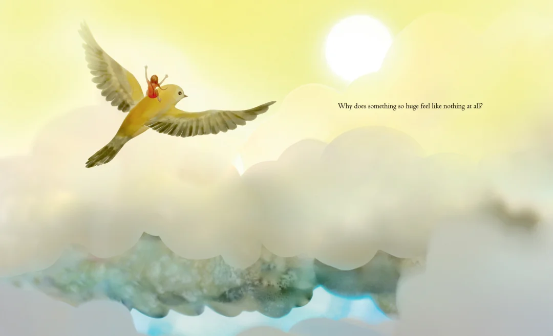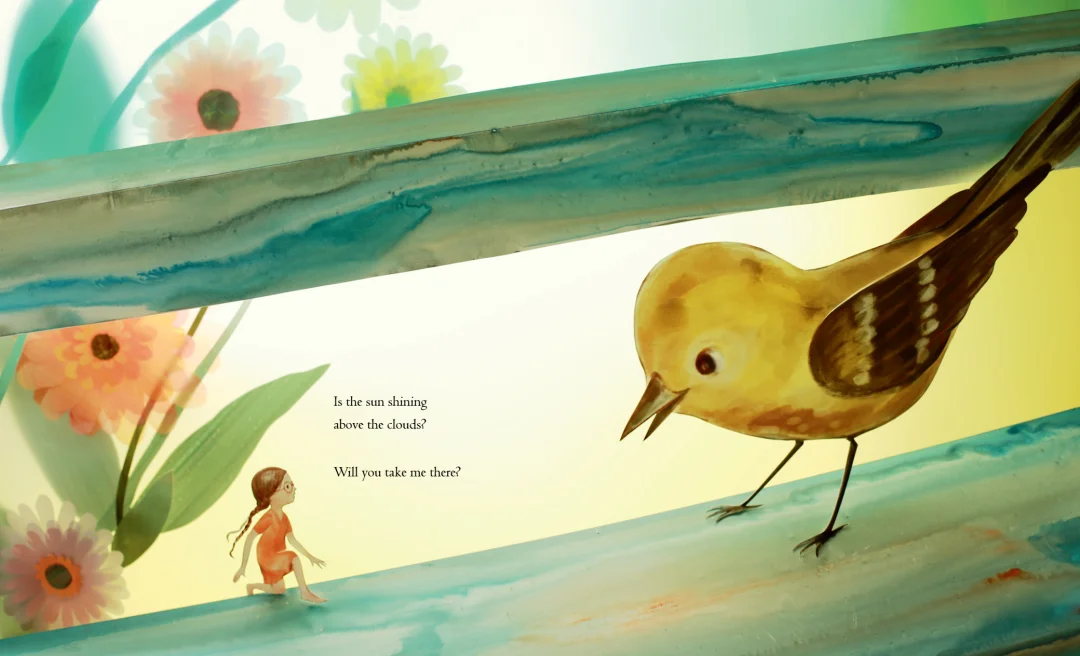 一个沉闷的阴天里,无聊的小女孩心中藏着一个小小的愿望——她渴望一缕阳光,驱散眼前的阴霾。就在这时,一只友善的小鸟悄然出现,轻轻衔起她的期待,带着她飞向天际,开启了一场奇妙的云端探险。