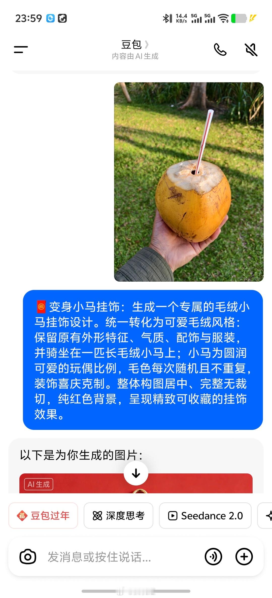 豆包红包可以的,用一只椰子的图片,马上就生成了公仔版本的椰子。太帅了。还领到1.