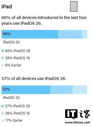 在iPad端,过去四年内推出的iPad中有66%运行iPadOS26;如果统计全部iPad设备,则有57%已升级至iPadOS26。