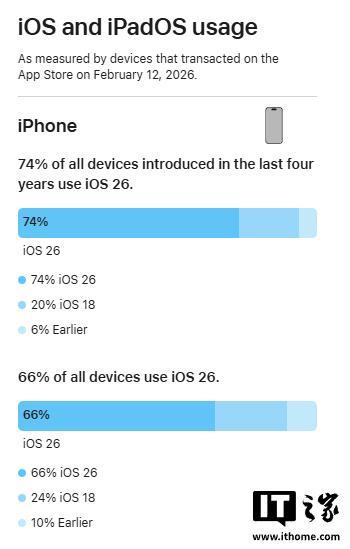IT之家2月14日消息,苹果公布了最新iOS26与iPadOS26系统的AppStore数据,展示目前有多少iPhone与iPad正在运行这两套系统版本。