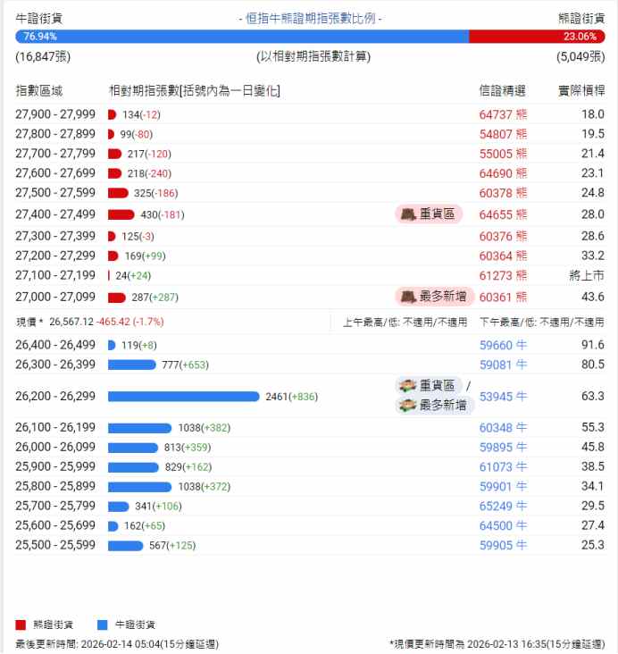 中信证券牛熊证街货分布图中的数据显示,熊证街货重货区在27,400-27,499区间,该区间最新熊证数量为430张,较上一交易日减少181张;熊证街货最多新增在27,000-27,099区间,该区间最新熊证数量为287张,较上一交易日增加287张。