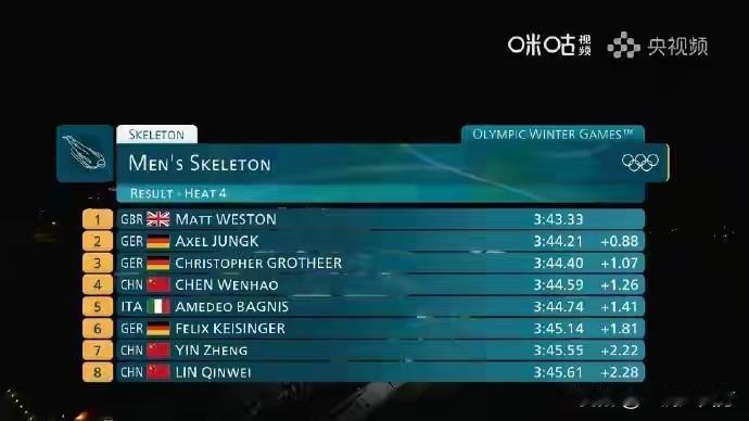 就差一点儿,中国队与米兰冬奥会男子钢架雪车奖牌失之交臂,没能再次北京冬奥会夺牌的场景。北京时间今天凌晨进行的决赛,三位参加预赛的中国选手全部进入决赛,经过四轮比拼,29岁的陈文浩以总时长为3分44秒59排名第4,仅落后第3名0.19秒,遗憾无缘奖牌,本赛季成绩突出的名将殷正以总用时3分45秒55排名第7,林勤炜以3分45秒61排名第8。