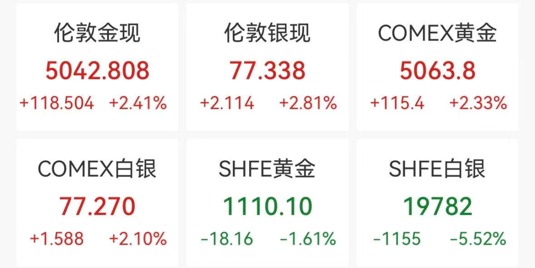 贵金属方面,黄金白银反弹,现货黄金涨2.4%,突破5040美元/盎司;现货白银涨2.8%,报77.3美元/盎司。