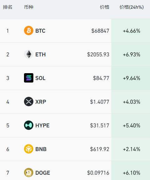 加密货币集体反弹,比特币涨超4%,逼近6.9万美元/枚,过去24小时全市场超9万人爆仓。
