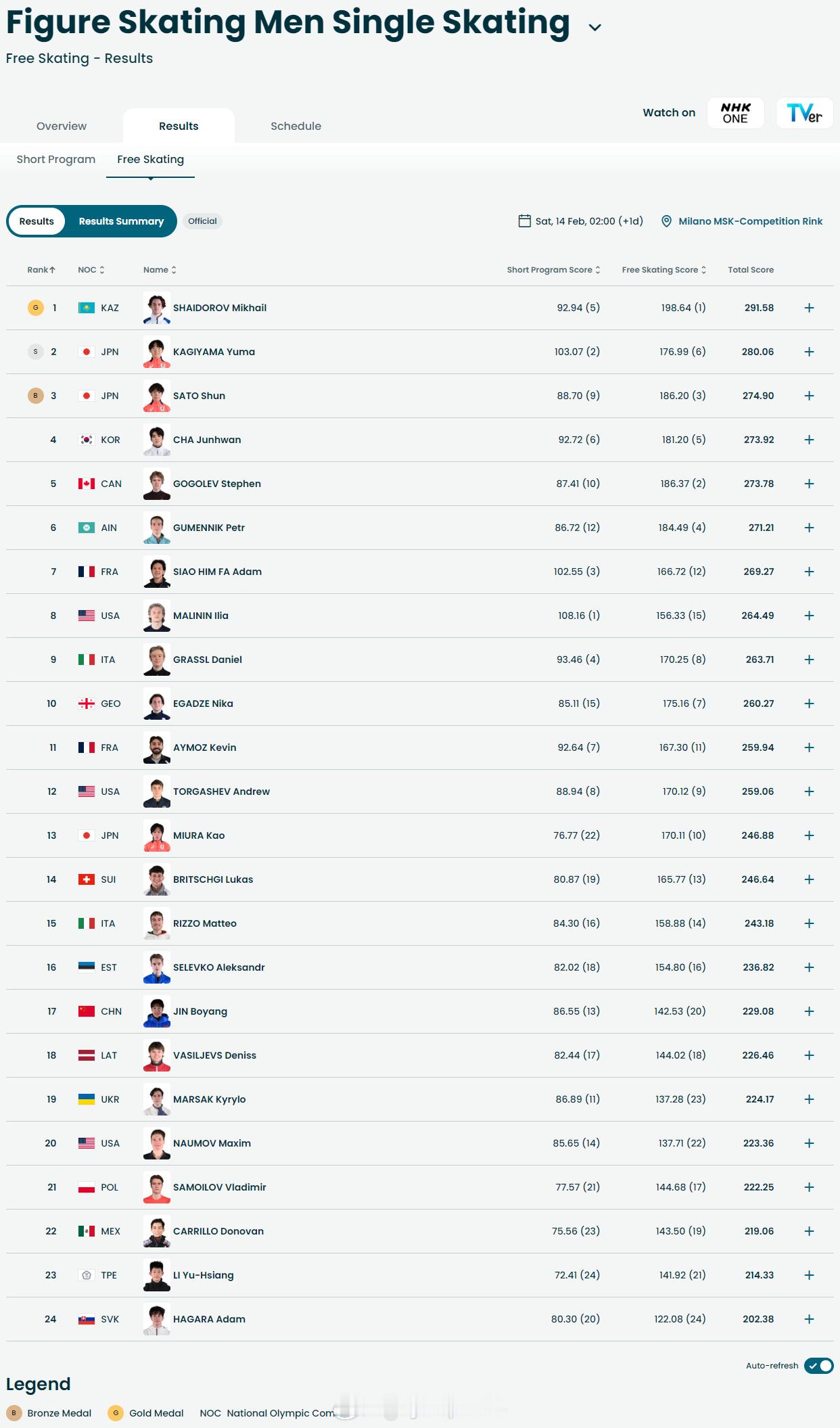 【冬奥男子单人滑大热倒灶 哈萨克斯坦夺冠马里宁仅第八】花滑米兰惨案金博洋自由滑142.53分冬奥会 2月13日,冬奥会花样滑冰男子单人滑比赛结束。赛前大热倒灶,美国选手马里宁自由滑崩了,仅得到156.33分,以总分264.49分排名第八!短节目排名第五的哈萨克斯坦选手沙多罗夫自由滑得到198.64分,以总分291.58分爆冷夺冠。这也是哈萨克斯坦冬奥会历史首枚花样滑冰金牌。日本键山优真和佐藤骏分获银铜牌,中国队金博洋名列第17,成绩为229.08分。