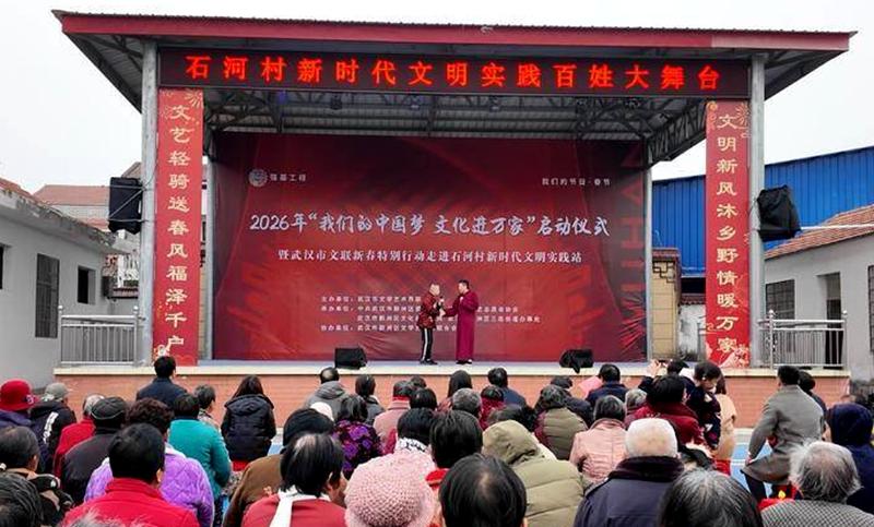 文化进万家,欢乐到基层。武汉文艺轻骑兵新春特别行动在三店街道石河村新时代文明实践大舞台举办,舞蹈、歌曲、相声、汉剧和湖北大鼓等精彩演出,丰富多彩的文艺节目和暖心志愿服务,为当地居民送去新春问候与祝福,现场欢声笑语不断,洋溢着浓浓的喜庆氛围。