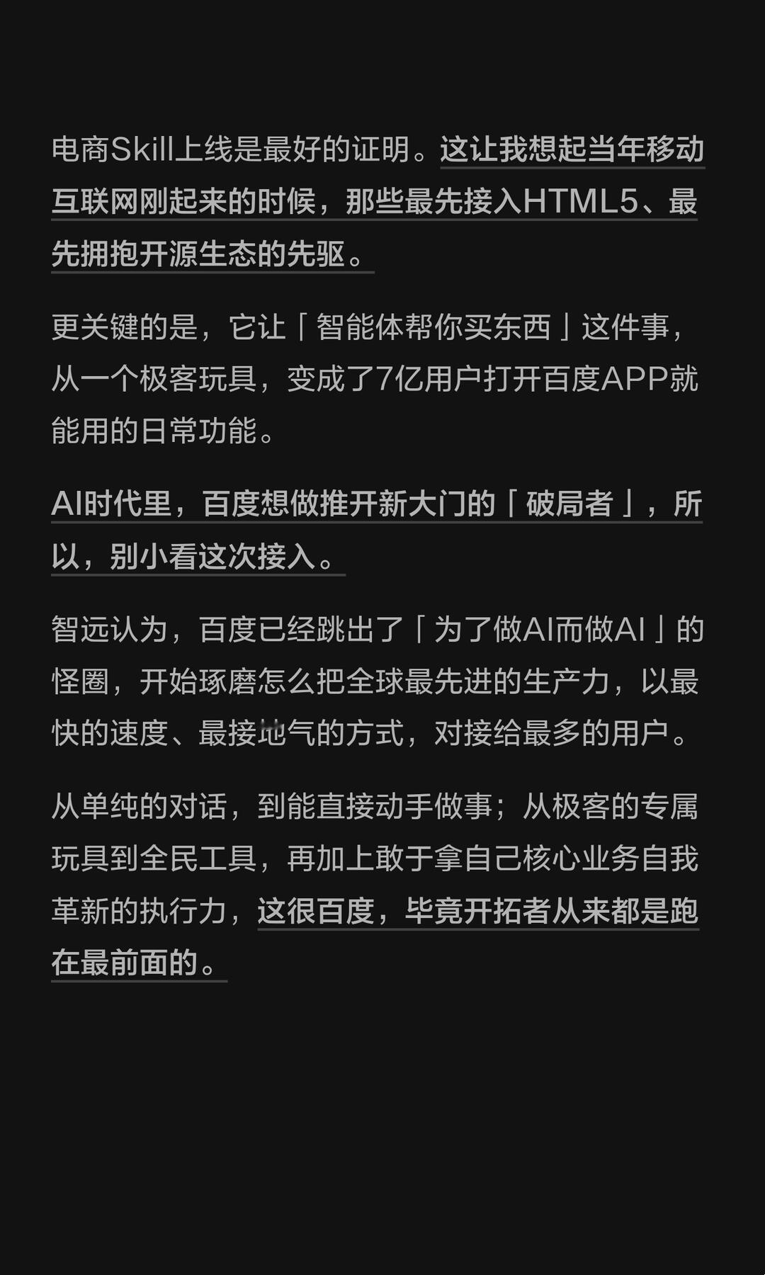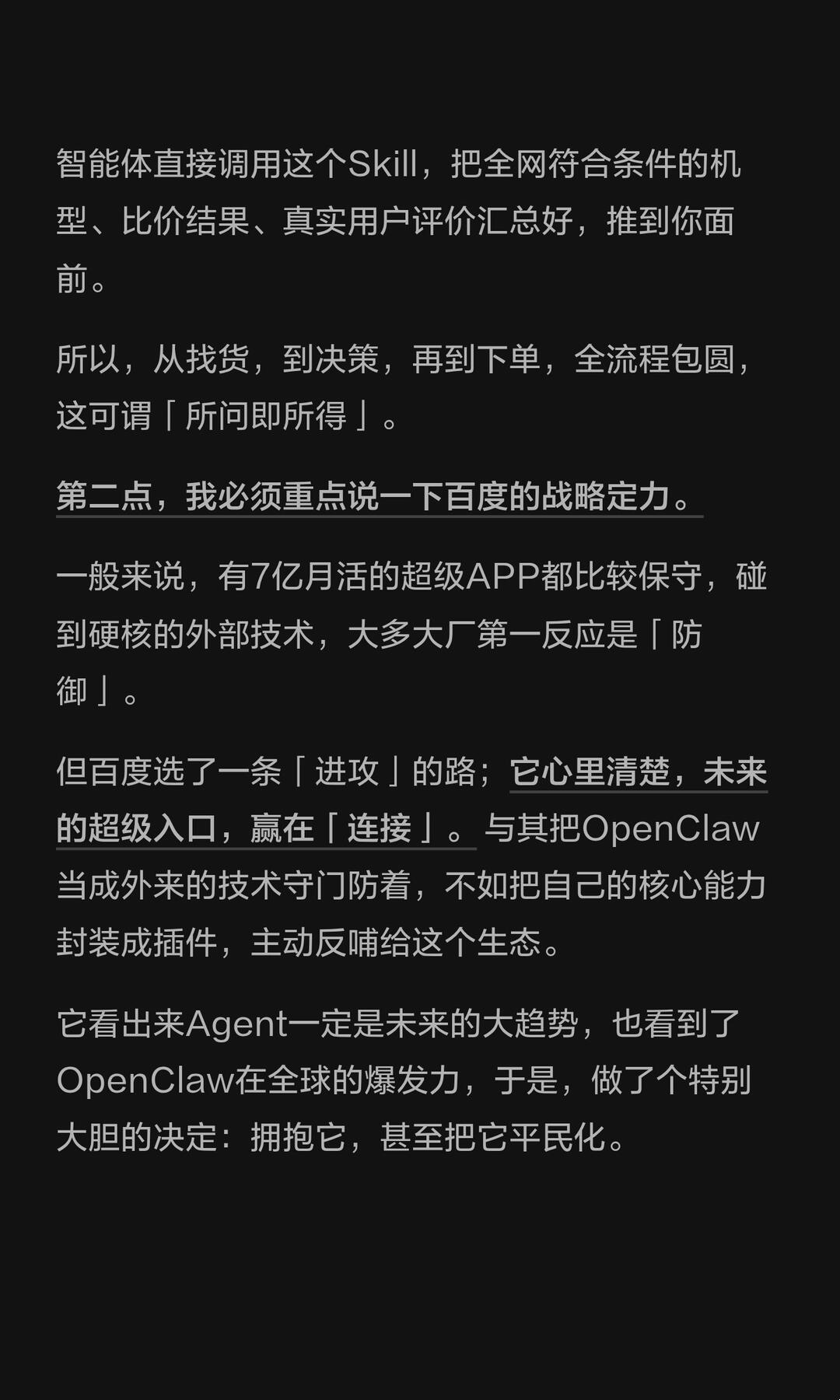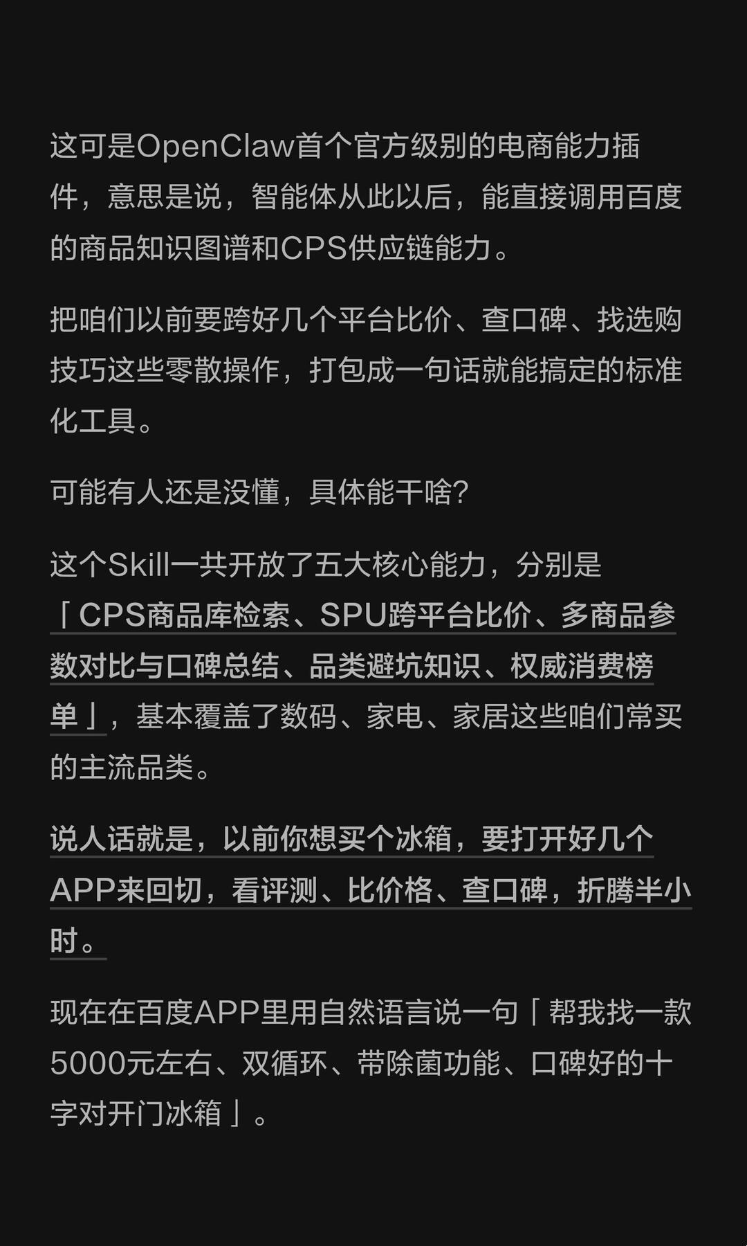 我这儿有个刚得到的最新消息,百度优选官方电商Skill正式上架OpenClaw生态的ClawHub了。 这可是OpenClaw首个官方级别的电商能力插件,意思是说,智能体以后,能直接调用百度的商品、知识图谱、CPS供应链能力。 把以前要跨好几个平台比价、查口碑、找选购技巧这些零散操作,打包成一句话就能搞定的标准化工具。 说人话就是,以前你想买个冰箱,要打开好几个APP来回切,看评测、比价格、查口碑,折腾半小时,现在在百度APP里用嘴说一句话就能搞定了。 百度已经跳出了「为了做AI而做AI」的怪圈,开始琢磨怎么把全球最先进的生产力,以最快的速度、最接地气的方式,对接给最多的用户,我认为,AI时代里,百度想做,推开新大门的「破局者」。
