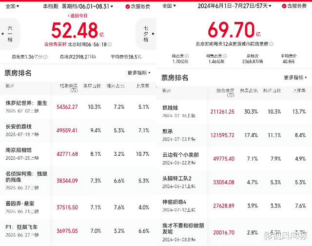 一个周末的票房爆发,尚不能完全扭转今年暑期档开局不利的局面。截至7月27日,今年暑期档票房达52.48亿元,距去年暑期档同期的69.7亿元仍有17亿元票房差距。