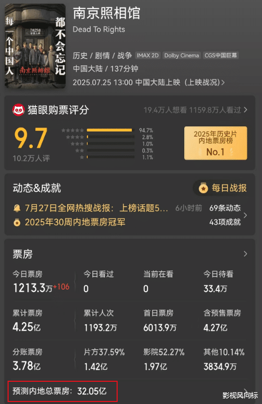 在众多影片中,《南京照相馆》无疑是上周末影市的最大亮点。这部以1937年南京大屠杀为背景的战争历史电影,自点映起就凭好口碑受到关注,7月25日正式公映后更是吸引众多观众走进影院。周六、周日连续两天单日票房破亿,周日票房逆增长,达到1.46亿。