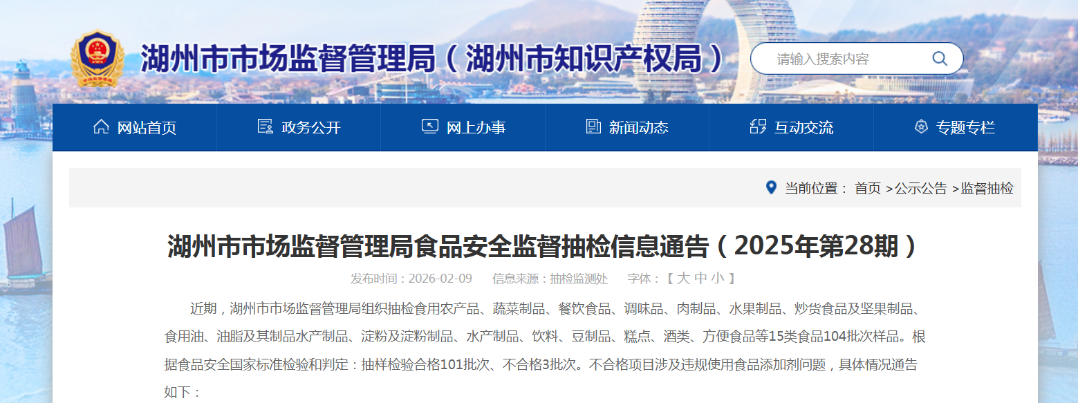 近期,湖州市市场监督管理局组织抽检食用农产品、蔬菜制品、餐饮食品、调味品、肉制品、水果制品、炒货食品及坚果制品、食用油、油脂及其制品水产制品、淀粉及淀粉制品、水产制品、饮料、豆制品、糕点、酒类、方便食品等15类食品104批次样品。根据食品安全国家标准检验和判定:抽样检验合格101批次、不合格3批次。不合格项目涉及违规使用食品添加剂问题,具体情况通告如下: