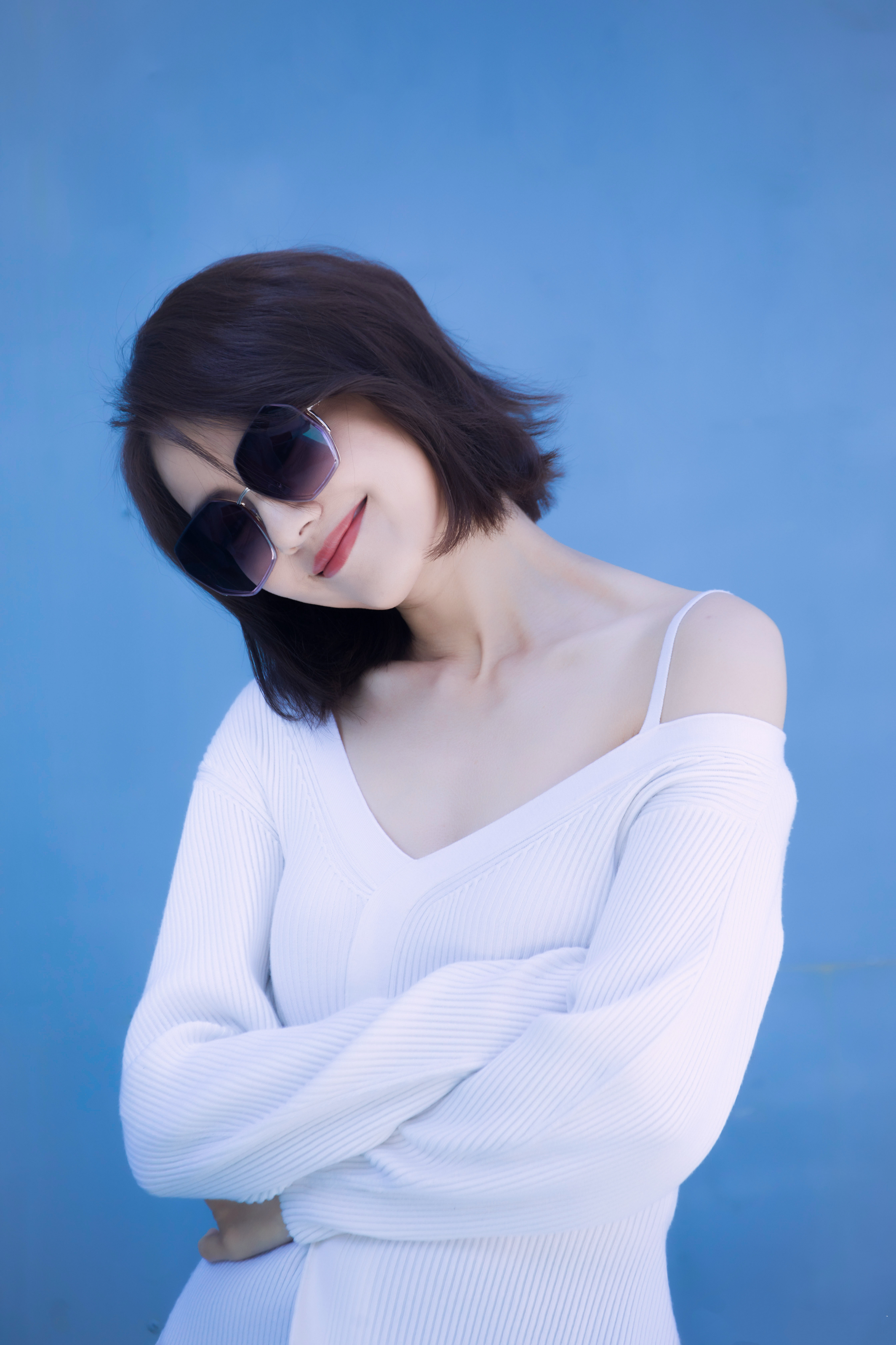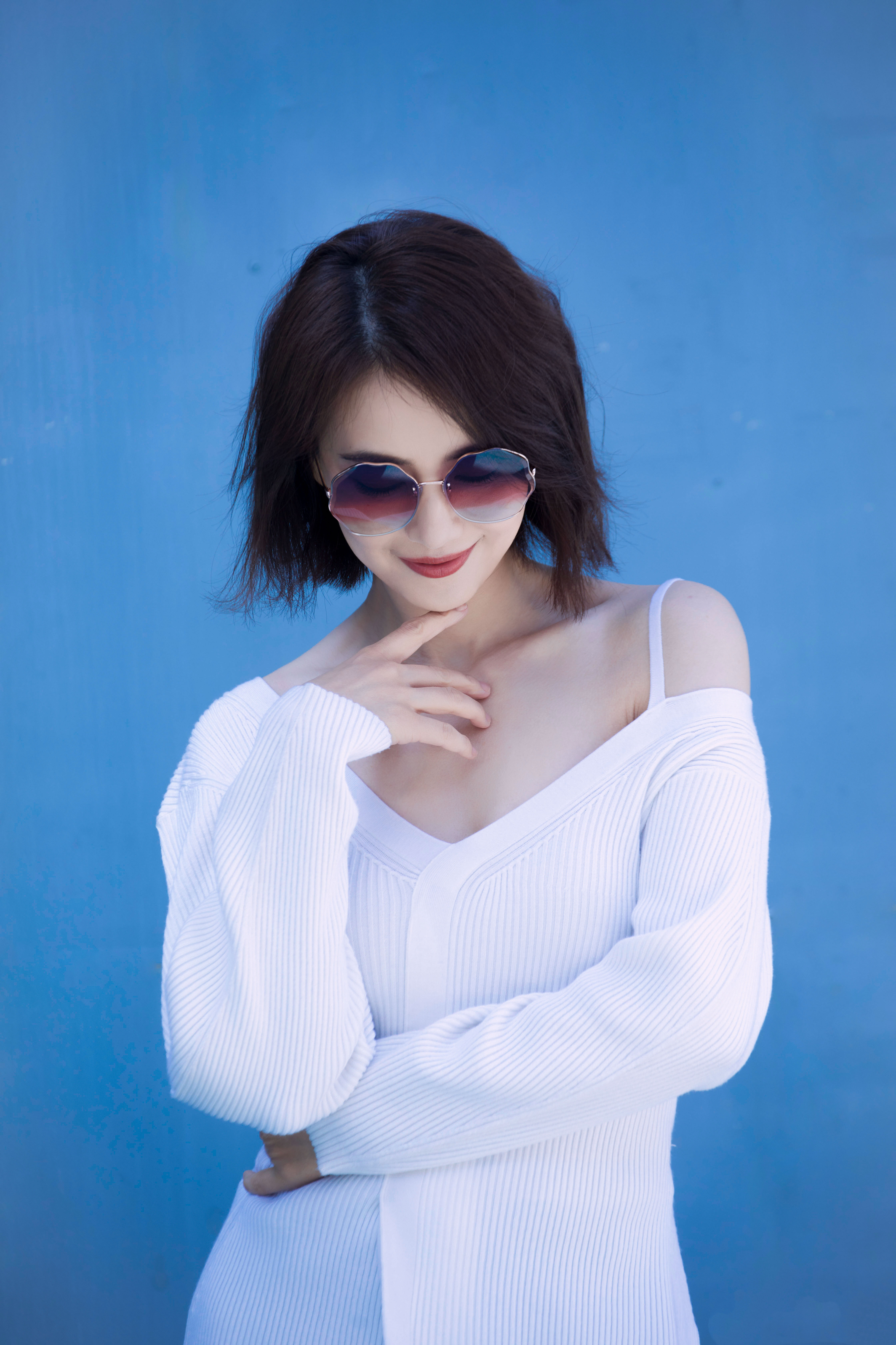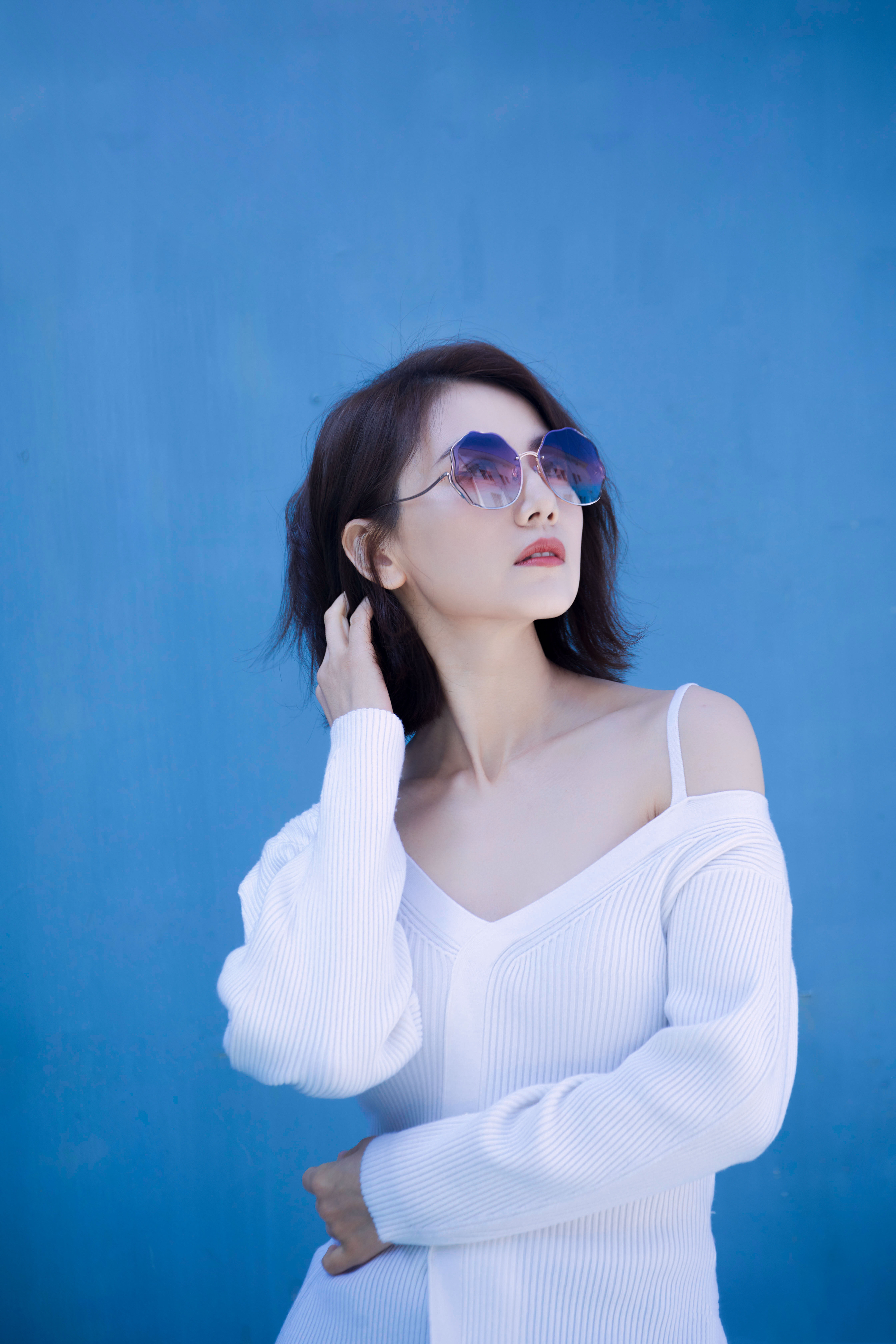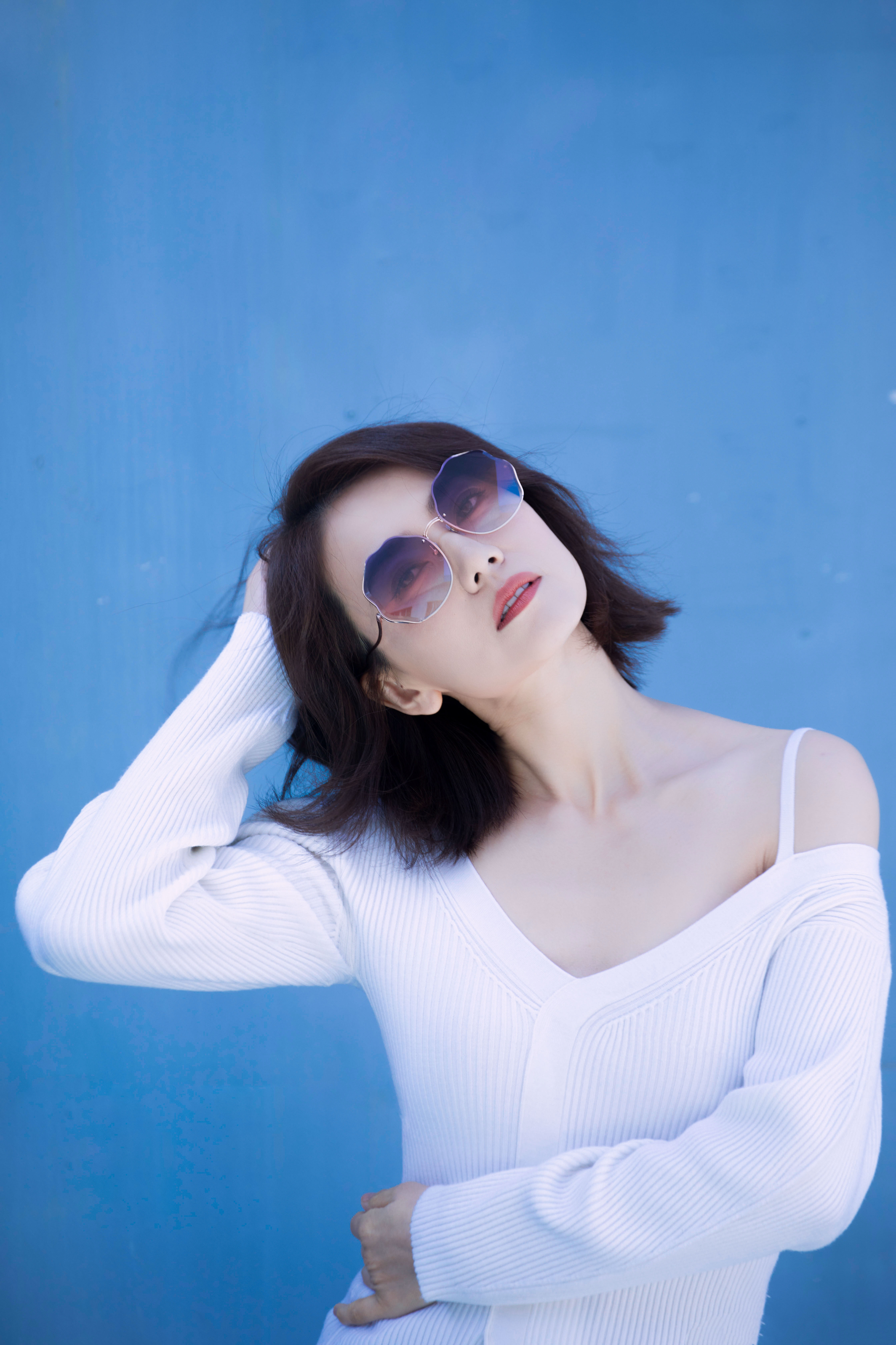 写真在色彩与氛围的把控上十分出色。纯净的蓝色背景与白色针织衫形成清爽对比,渐变粉紫墨镜则为画面注入灵动色彩,让整体视觉干净又不失时尚感。人物姿态舒展自然,单手撩发、轻触耳际,松弛又自信,眼神透过镜片传递出慵懒时髦的氛围。柔和均匀的光线,既凸显了优雅气质,又营造出轻松惬意的夏日感,是兼具质感与氛围感的优质写真。高圆圆