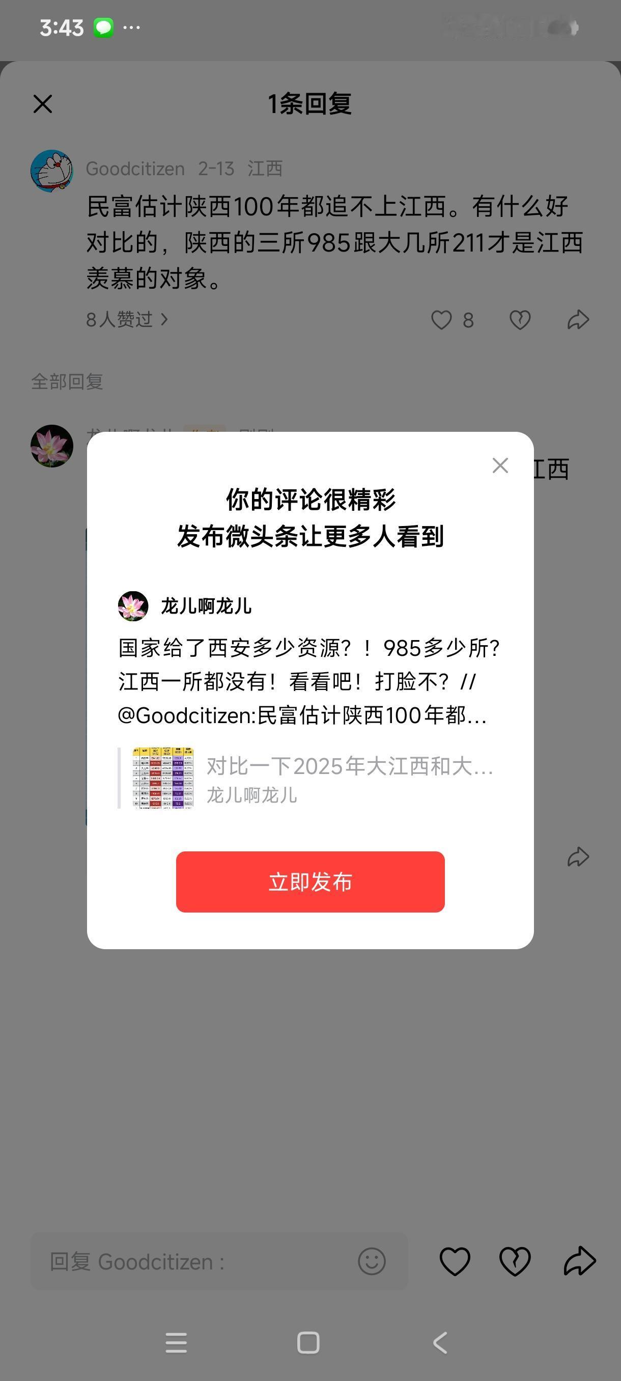 国家给了西安多少资源?!985多少所?江西一所都没有!看看吧!打脸不?//@Goodcitizen:民富估计陕西100年都追不上江西。有什么好对比的,陕西的三所985跟大几所211才是江西羡慕的对象。