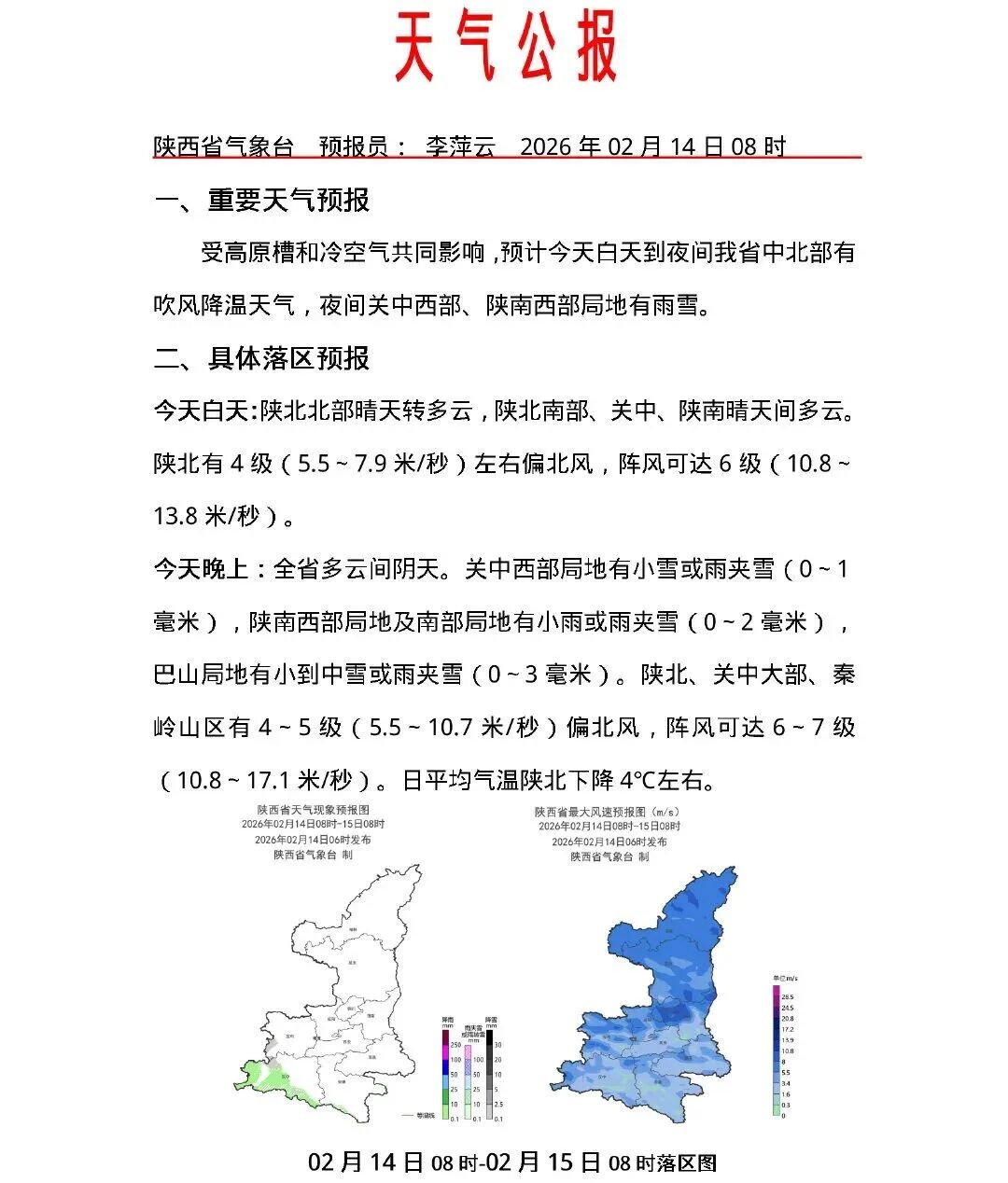 2月15日:全省阴天间多云。关中南部、陕南有小雨或雨夹雪,陕南南部局地有中雨;延安南部、关中北部、秦巴山区有小雪或雨夹雪,秦巴山区局地有中雪,巴山局地有冻雨。日平均气温全省大部下降4~6℃,陕北北部、关中西北部局地、秦岭山区和陕南东部下降6~8℃。