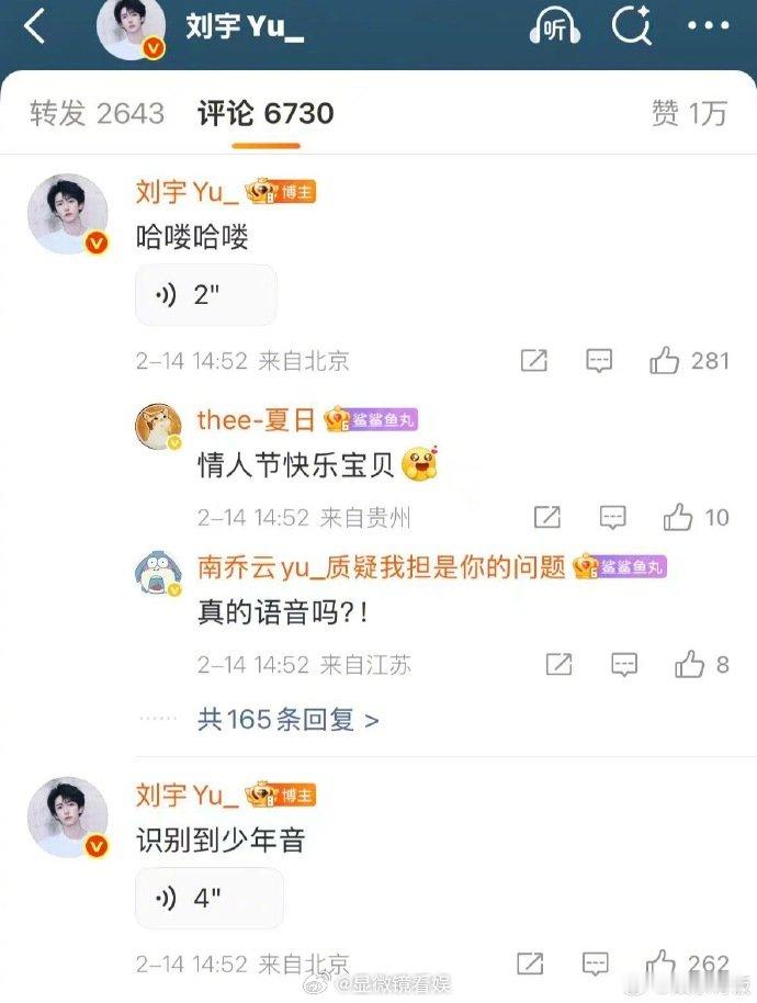 刘宇语音回复识别到少年音 情人节限定语音已送达!刘宇用少年音在线宠粉,听完只想问