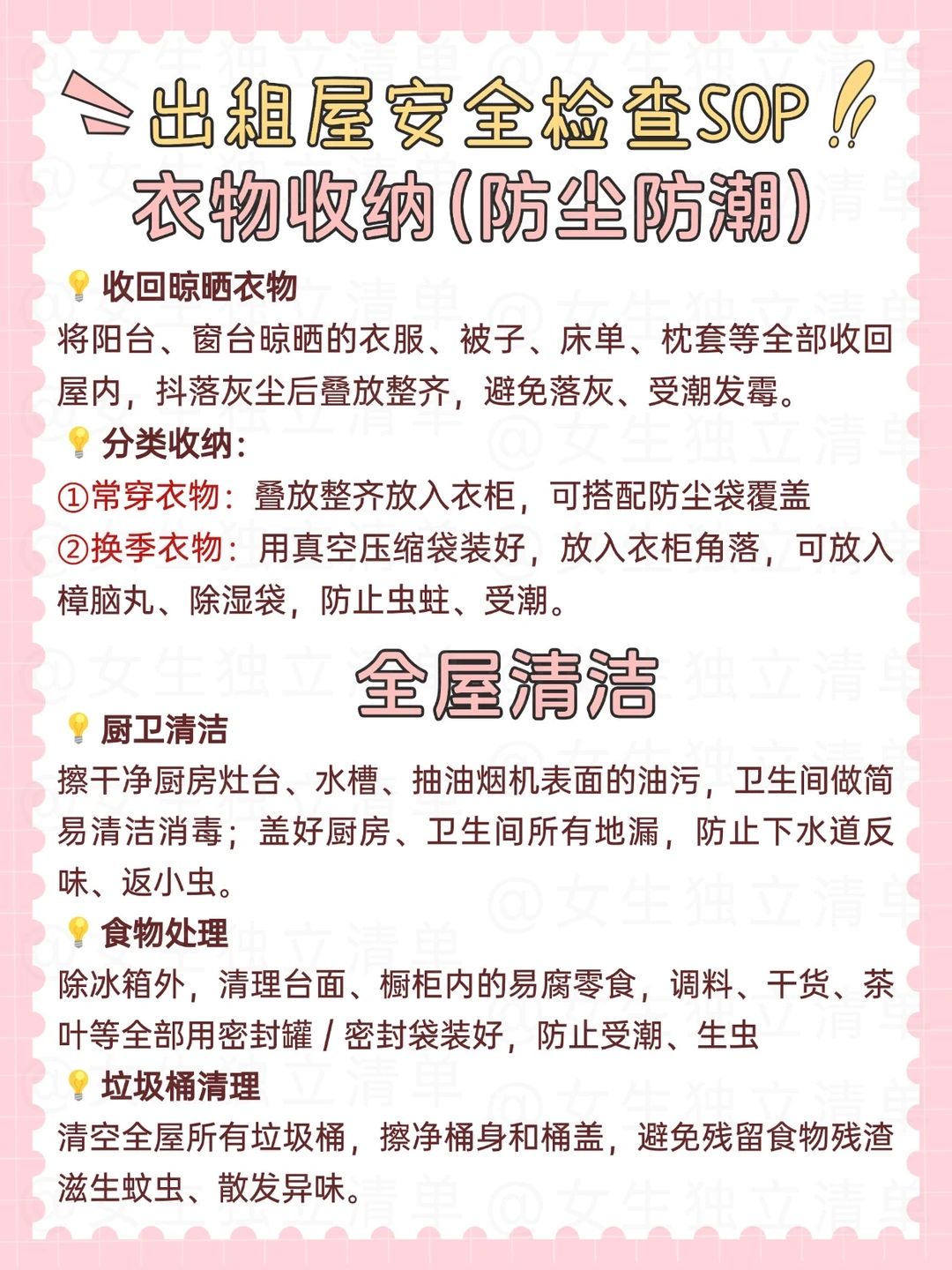 忙活一年终于过年啦~收拾好东西回家前一定要检查好这些安全隐患,仔仔细细检查,开开心心过年~ - ✅断电大排查(最关键) 🔺拔掉所有非必要电器插头:热水器、空调、电暖器、电磁炉、电脑、充电器、路由器等 🔺关闭全部插线板总开关,床头、沙发旁重点检查 🔺离家≤3天:冰箱通电,只留不易腐食材 🔺离家>7天:冰箱全清空、断电擦干,门留缝防臭 - ✅断水防漏 🔺关闭屋内总水阀 🔺拧紧水龙头、花洒、洗衣机水管接口,擦干水渍 🔺清空洗手池、浴缸、马桶积水,盖好马桶盖 - ✅防火安全 🔺关闭燃气总阀+灶台开关,检查胶管是否老化、开裂 🔺清理阳台、厨房易燃物:纸箱、塑料袋、打火机、酒精等 - ✅门窗安防 🔺关严锁死所有窗户,阳台推拉门反锁,拉好窗帘 🔺大门务必反锁,备用钥匙交可信人,不藏门外 🔺监控检查电量、网络,确保正常工作 - ✅贵重物品保管 🔺证件、手机、电脑、首饰、现金全部随身带走 🔺不便携带的贵重品锁进抽屉/衣柜,隐私单据撕碎丢弃 - ✅衣物收纳 🔺收回阳台所有晾晒的衣服、被褥,叠放整齐 🔺换季衣物用压缩袋装好,放除湿/防虫用品 🔺清空衣物口袋,鞋子擦净收纳 - ✅食物处理 🔺冰箱按离家时长清空,杜绝食物变质发臭 🔺台面、橱柜易腐食物全部清理 🔺干货、调料、未开封零食密封保存 - ✅宠物安排 🔺无法带走的宠物,托付亲友或正规宠物店寄养 🔺消毒液、药品、尖锐物品收好,防止宠物误食 - ✅全屋清洁 🔺擦净厨房油污,卫生间简单消毒,盖好地漏防反味 🔺擦净台面、地面,清空所有垃圾桶 🔺花盆倒掉积水,避免烂根生虫 - ✅快递处理 🔺离家前暂停网购,快递改地址或找人代收 🔺清理门口快递盒,撕掉个人信息单 - ✅出门前5分钟核查 🔺水电燃气总阀已关 🔺门窗全部反锁 🔺贵重物品收好 🔺垃圾/易燃物清完 🔺宠物/快递安置妥当 -