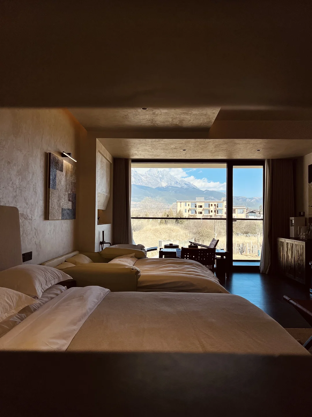 放下行李先在酒店躺了会儿,房间窗景直接封神!拉开窗帘就是连绵的雪山🏔️