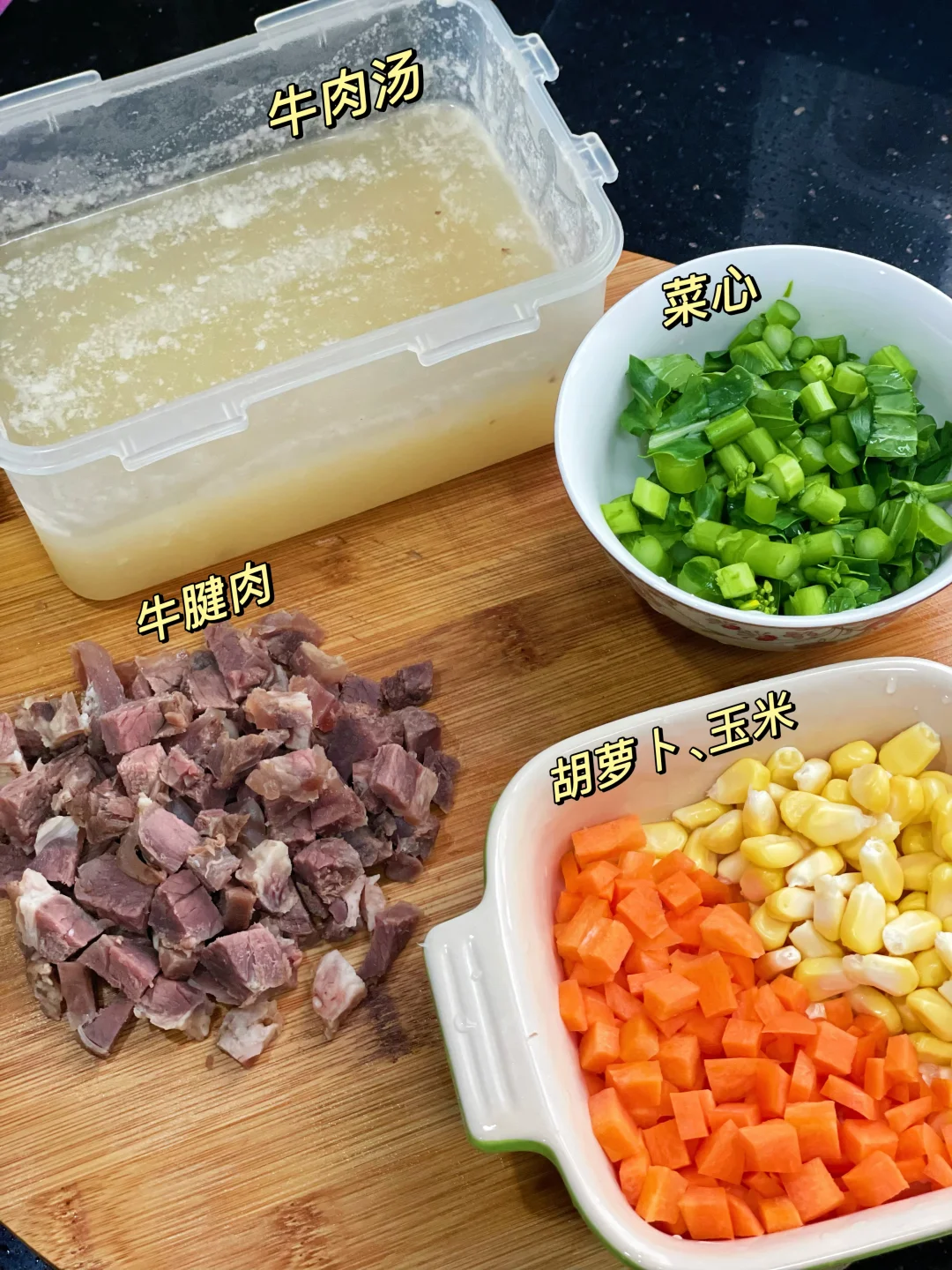 的三餐四季 🌟牛肉蔬菜烩饭 盐水牛腱肉|牛肉汤|玉米|胡萝卜|青菜 1️⃣所有食材切粒 2️⃣大米和小米洗净加入胡萝卜、玉米、牛肉汤、牛肉,按下煮饭键 3️⃣菜心提前焯水,米饭煮好后把菜心拌入,适量盐、生抽调味即可 ❤️盐水牛腱肉的做法: 新鲜的牛腱用盐腌制24-48小时,放在高压锅中,加姜、清水。炖煮20分钟左右即可。炖煮后汤保留,牛腱肉冷却用保鲜膜包好(可以冷藏一周)。汤用来煮饭煮面都可以,肉可以用来炒也可以直接吃。