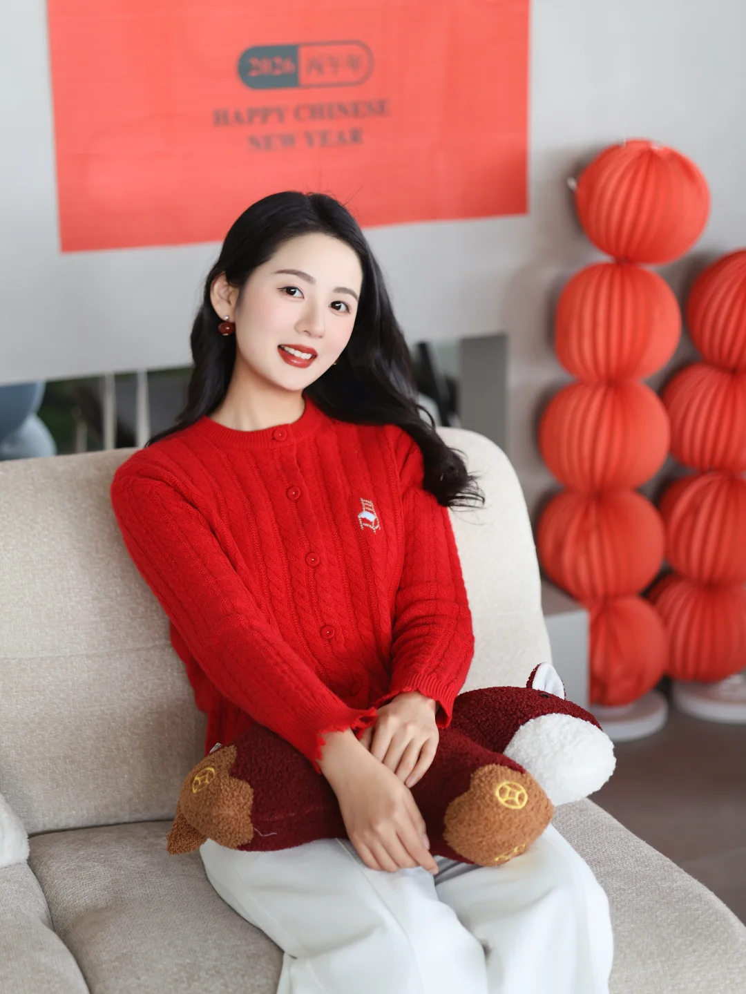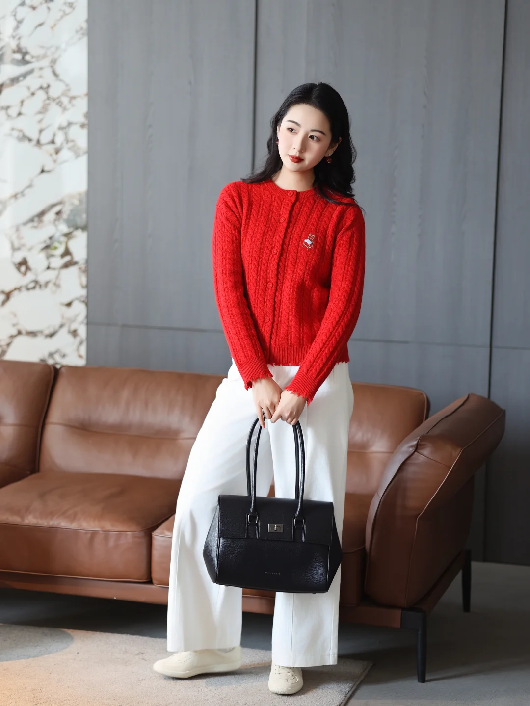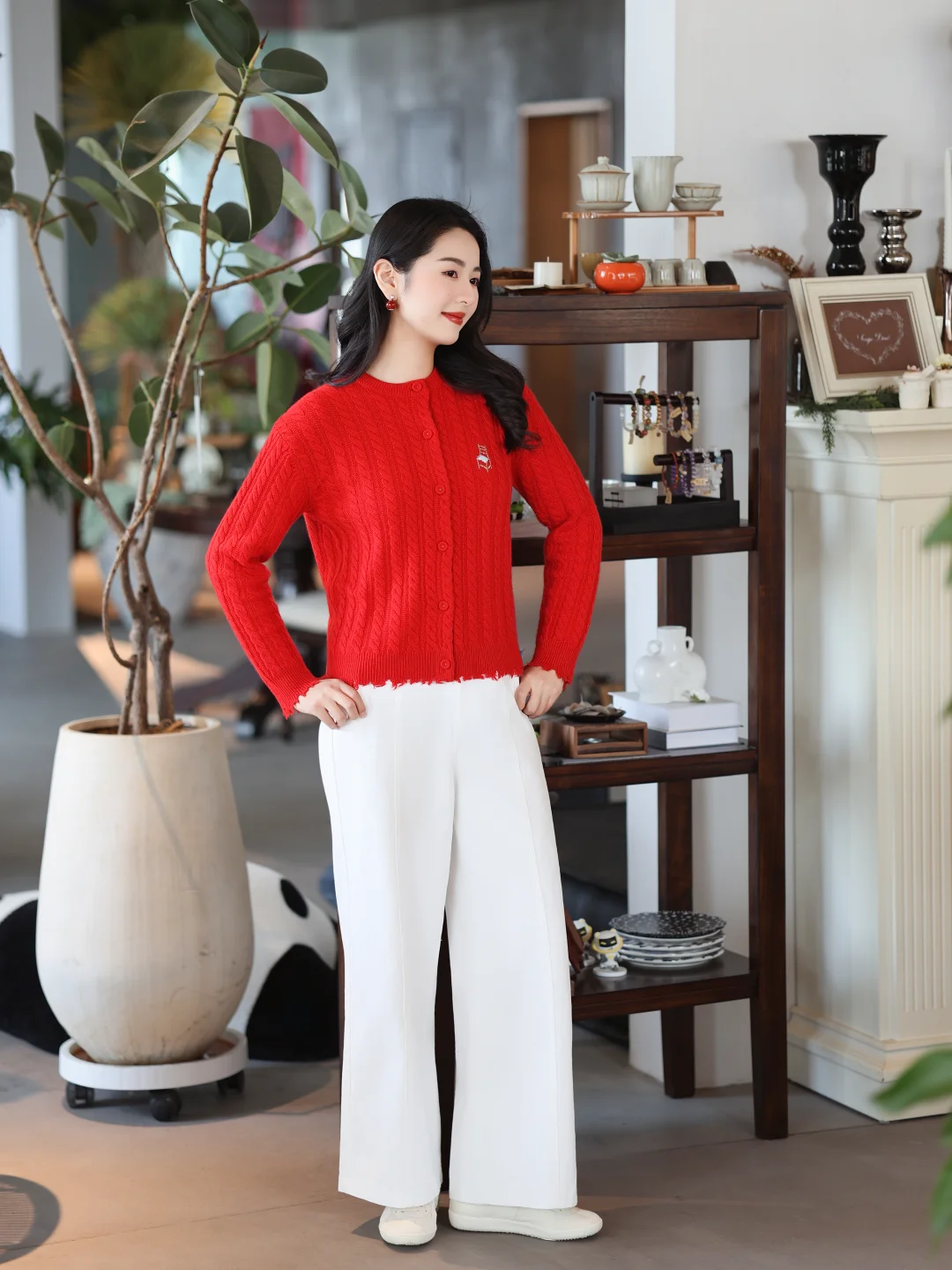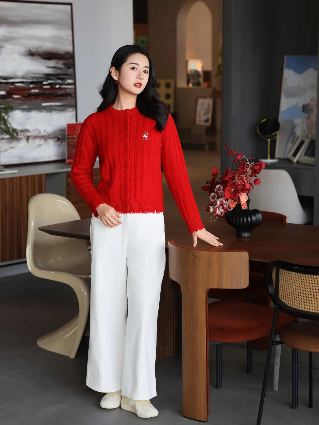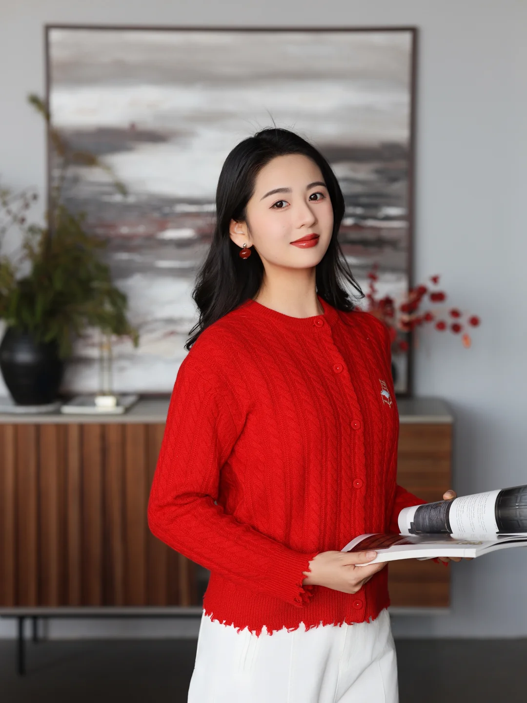 正红色山羊绒开衫拉满节日氛围