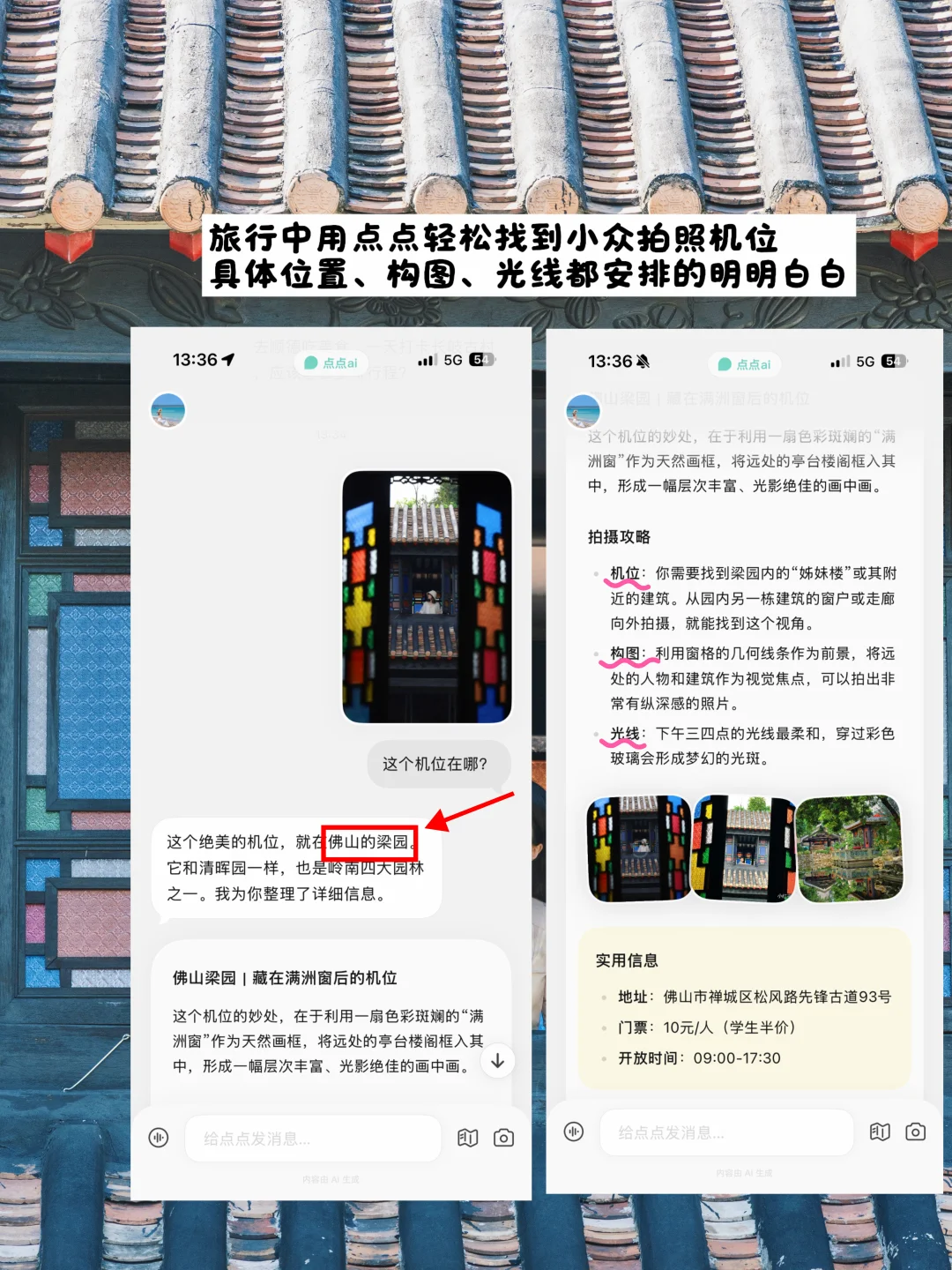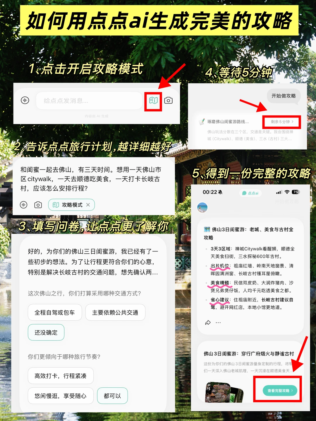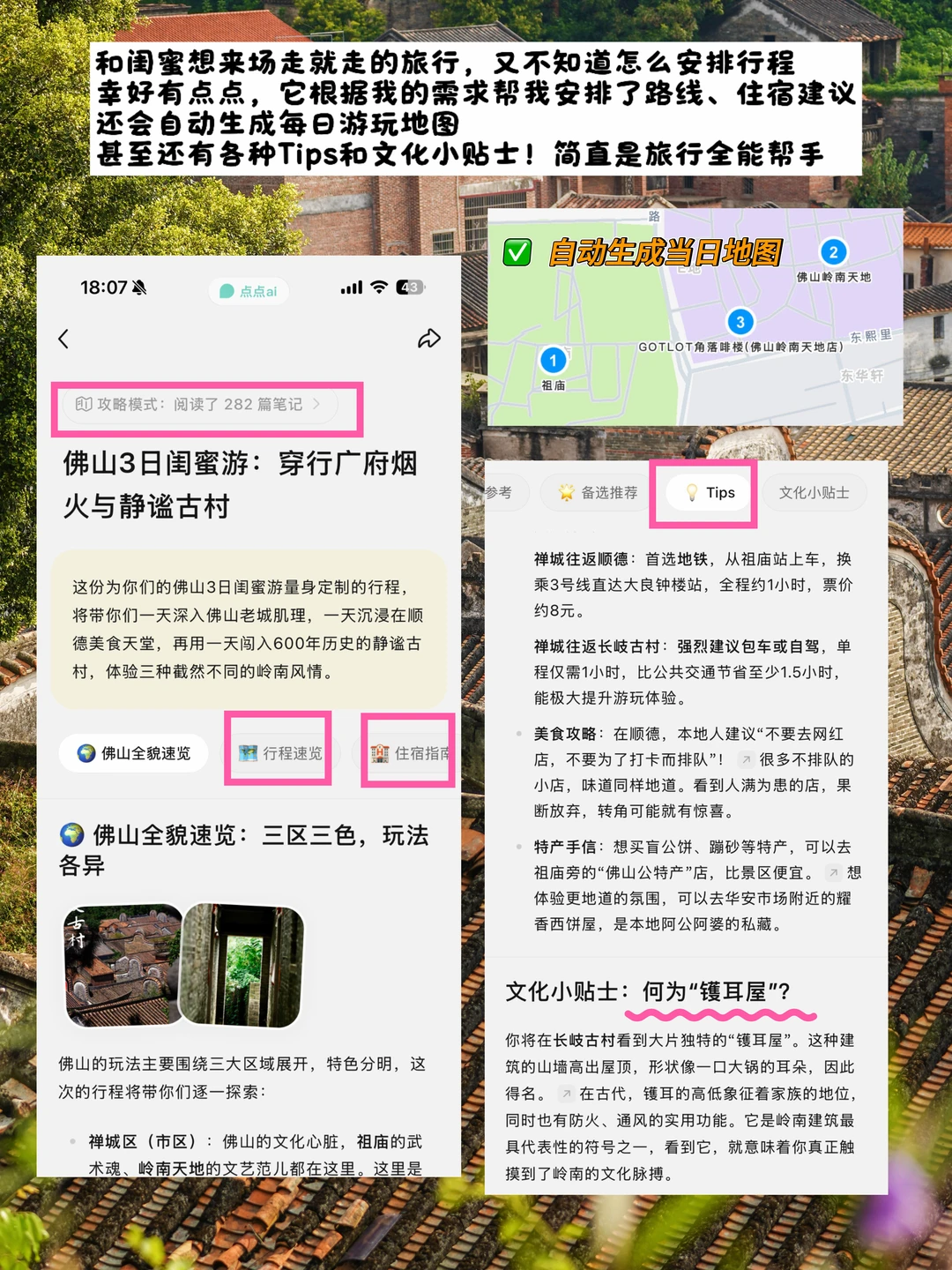 ·📱这次来佛山,攻略全程都是靠点点ai帮我规划。它是自己的ai,从路线规划、古建知识到本地人私藏美食,真的被它惊艳到!尤其是点点app里的【攻略模式】,再也不用翻几百篇笔记了!它相当于直接把最懂怎么玩、怎么拍、怎么吃的一批人找来给我定制专属行程!不仅看笔记,连评论区里大家的真实评价都帮我总结好👏