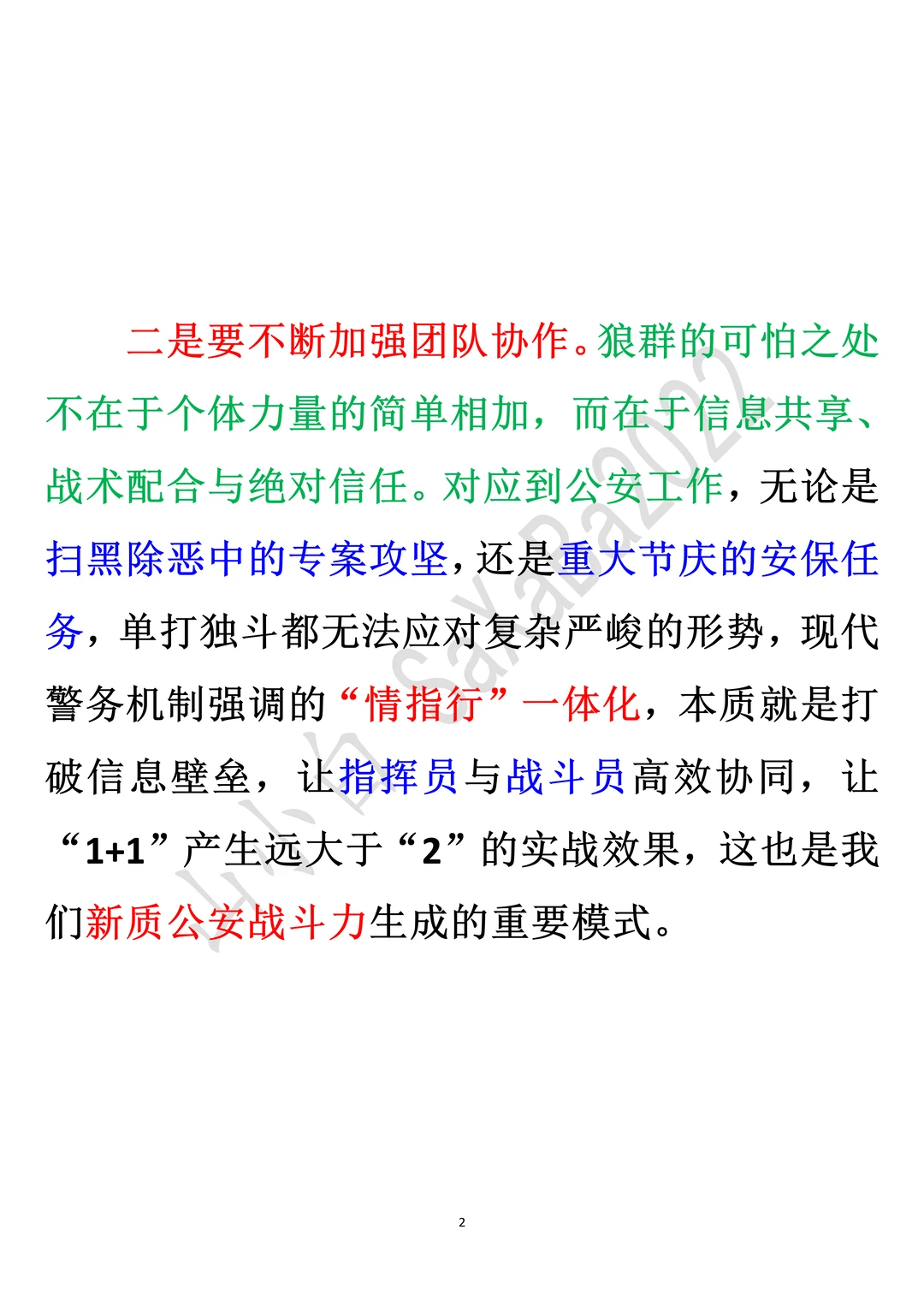 ◆二是要不断加强团队协作。狼群的可怕之处不在于个体力量的简单相加,而在于信息共享、战术配合与绝对信任。对应到公安工作,无论是扫黑除恶中的专案攻坚,还是重大节庆的安保任务,单打独斗都无法应对复杂严峻的形势,现代警务机制强调的“情指行”一体化,本质就是打破信息壁垒,让指挥员与战斗员高效协同,让“1+1”产生远大于“2”的实战效果,这也是我们新质公安战斗力生成的重要模式。