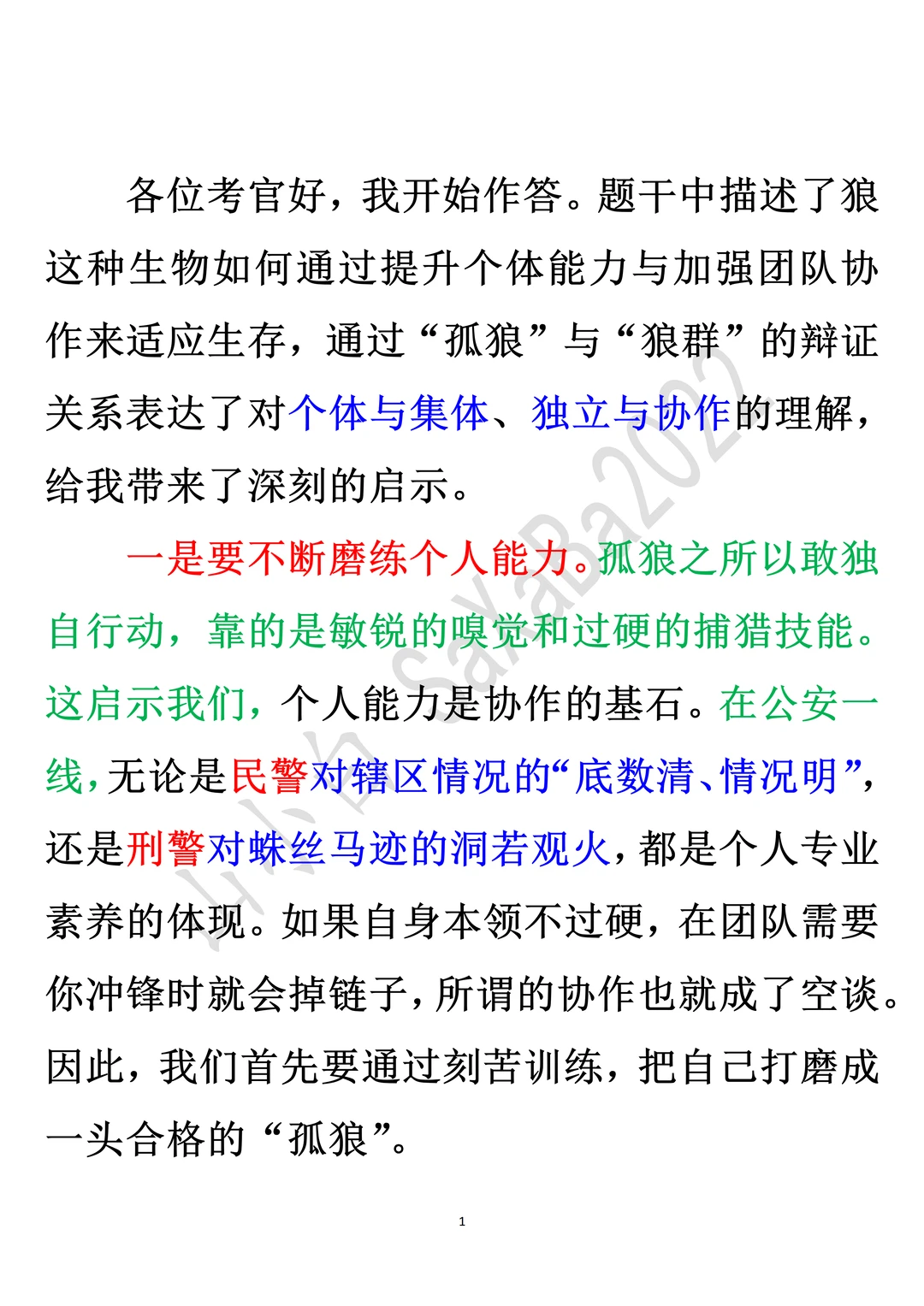 ◆各位考官好,我开始作答。题干中描述了狼这种生物如何通过提升个体能力与加强团队协作来适应生存,通过“孤狼”与“狼群”的辩证关系表达了对个体与集体、独立与协作的理解,给我带来了深刻的启示。