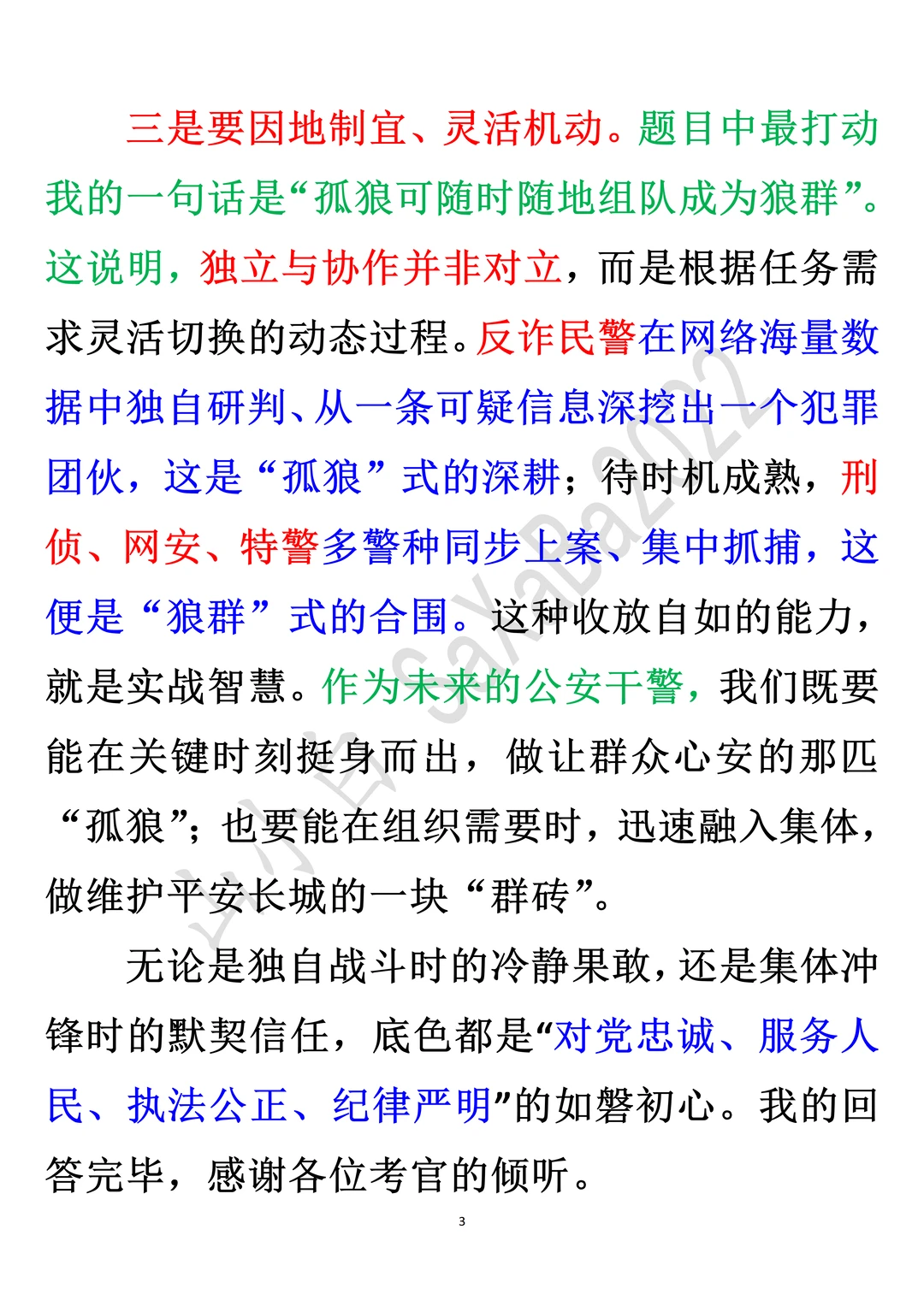 ◆无论是独自战斗时的冷静果敢,还是集体冲锋时的默契信任,底色都是“对党忠诚、服务人民、执法公正、纪律严明”的如磐初心。我的回答完毕,感谢各位考官的倾听。