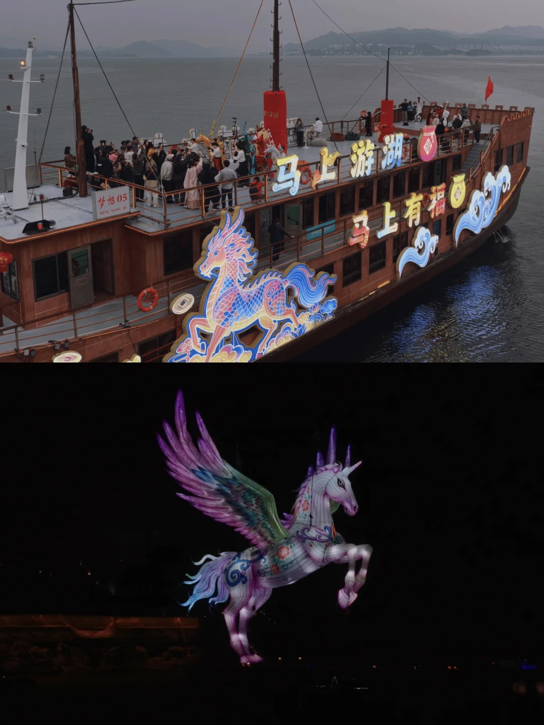 1️⃣ 带娃游湖只选中心湖区,船班密、码头近,不用早起赶路。春节船上/月光岛有锦鲤姐姐送福,互动就有新年福袋/小礼物,娃超开心;月光岛春节限定:天马行空装置、金龙巡游、无人机秀、烟花秀,夜景封神,记得留到天黑!
