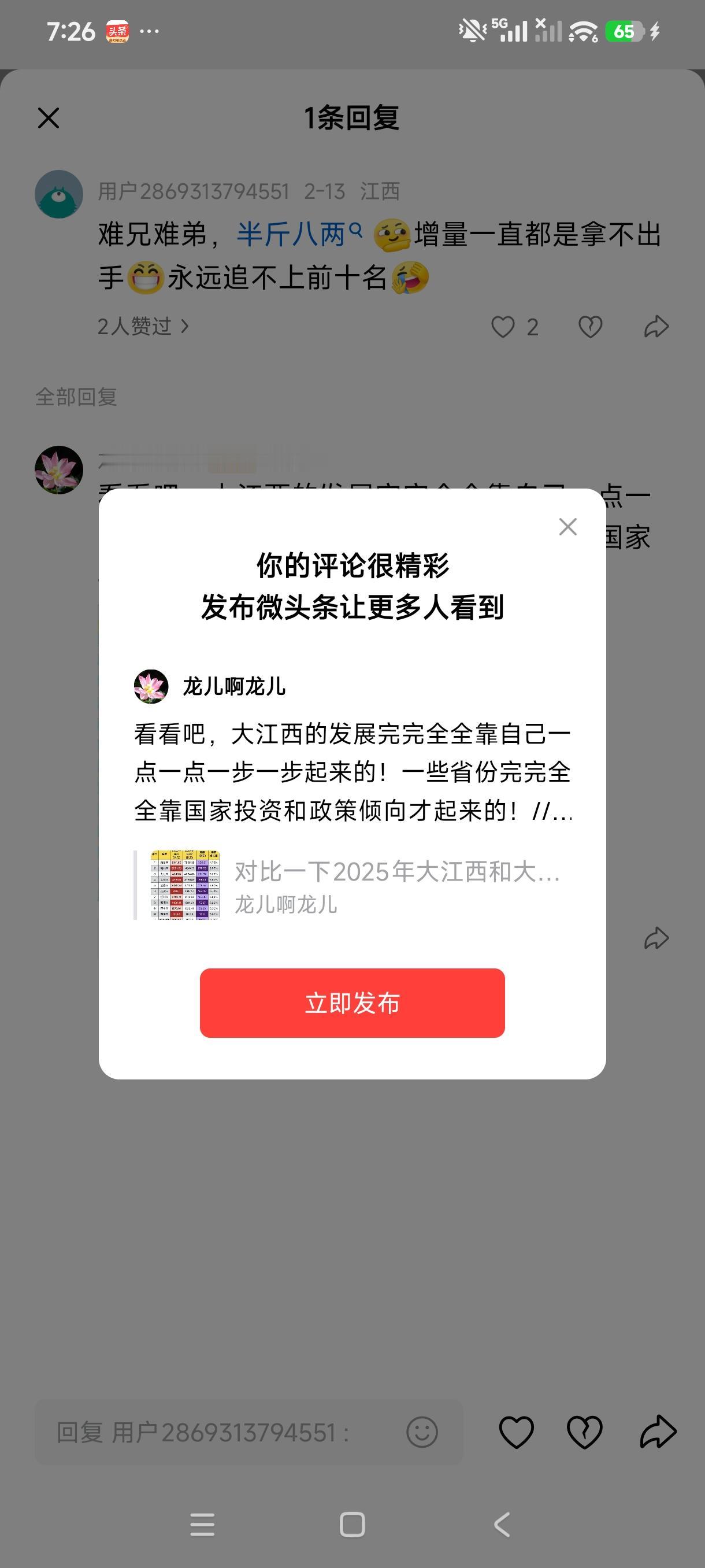 看看吧,大江西的发展完完全全靠自己一点一点一步一步起来的!一些省份完完全全靠国家投资和政策倾向才起来的!//@用户2869313794551:难兄难弟,半斤八两[机智]增量一直都是拿不出手[呲牙]永远追不上前十名[我想静静]