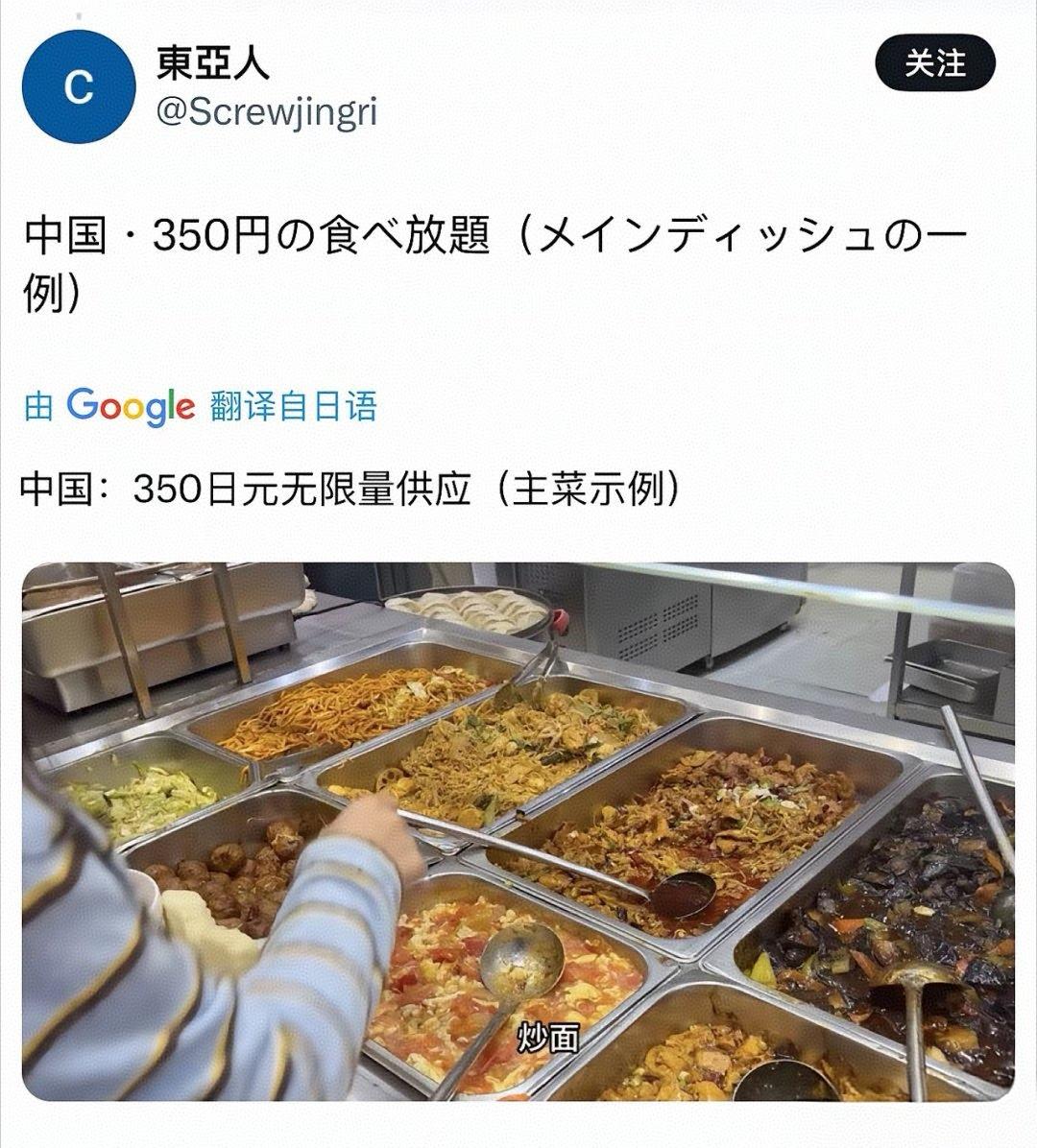 日本网友炫幸福感,说她花350日元可以吃到热气腾腾的米饭和味噌汤,管不管饱不知道,反正她觉得很幸福,配图就是一碗米饭、一碟泡菜、一份味噌汤。然后中国网友直接上图,图中至少八个菜,有荤有素,米饭或面条自己选,350日元管饱。这下又让日本网友破防了,说不可能。马上就有中国网友补位,说自己去去即墨出差,酒店附近一个16元东北盒饭自助,一个26元水饺自助,一个59元烤肉自助,在即墨呆了仨月,吃得我都快出栏了(猪长膘就要出栏)。