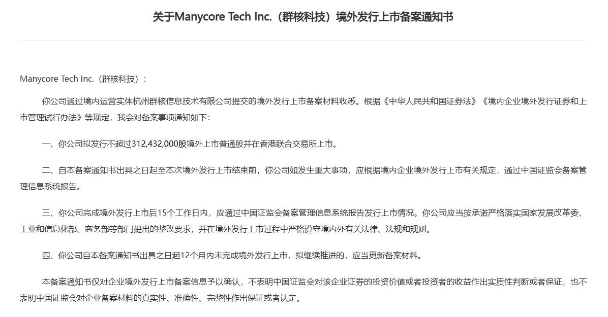 14日,证监会网站发布《关于ManycoreTechInc.(群核科技)境外发行上市备案通知书》(以下简称《上市备案通知书》)。