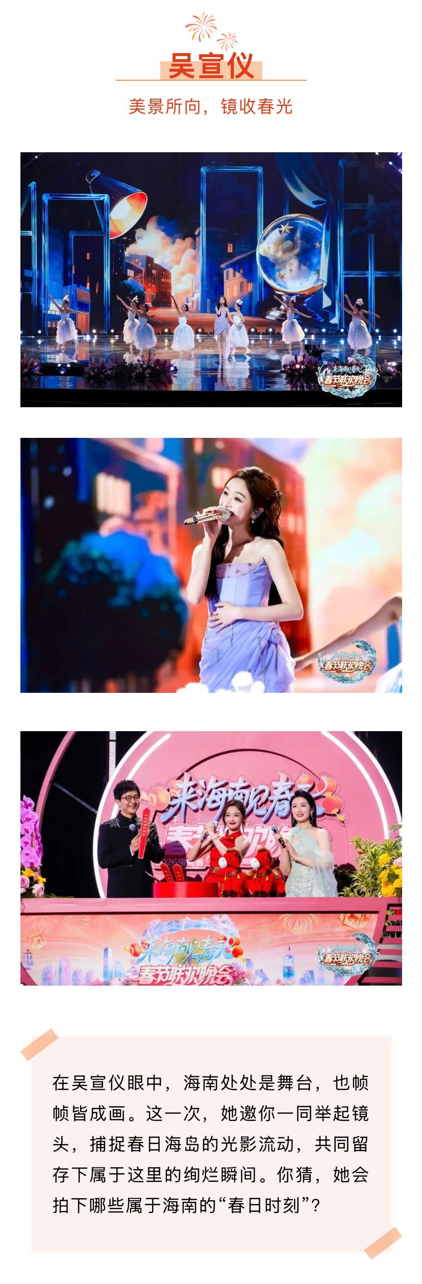 吴宣仪.2026海南春晚官宣吴宣仪 海南春晚吴选相关“在吴宣仪眼中,海南处处是舞台,也帧帧皆成画。这一次,她邀你一同举起镜头,捕捉春日海岛的光影流动,共同留存下属于这里的绚烂瞬间。你猜,她会拍下哪些属于海南的“春日时刻”?”