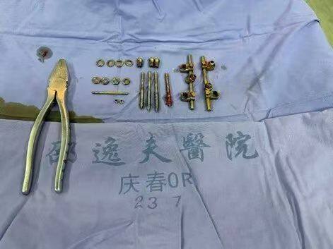 手术当天,范顺武在手术室里坐镇指挥。手术台上,胡子昂主任带领他的学生倪维宇主治医师进行手术操作,在几乎试过所有拆钉器械后,胡子昂反而在最简单的老虎钳上找到了手感。一圈一圈,一个垫片一个垫片,一个钉子一个钉子,完整地取出了整套内固定系统。