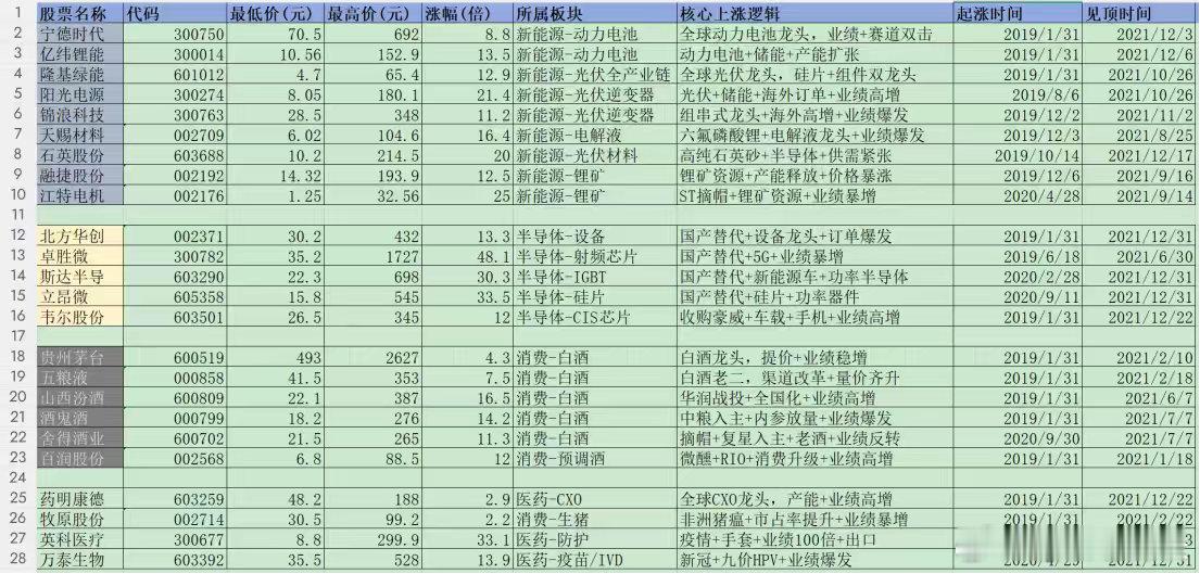 上一篇文章,我们梳理了2014~2015年大部分十倍股的盘面情况以及政策梳理。十倍股的基因(2014~2015年行情)其实每一波行情都有有重要的决定性事件引导产生的。比如:2014年的行情实际上是康师傅被查。指数从此一骑绝尘,再也没有回头过!而2019年的行情,武僧更愿意把它的主因归为《特斯拉上海建厂》武僧当时参与了一个新能源的一级市场的项目。跟很多地方ZF洽谈过相关事宜,凡到之处、无不谈新能源!不提下新能源、辅助驾驶,就感觉是市场的LOSER!从一级市场能感知到新能源行业的景气周期在路上!正是因为特斯拉建仓,才导致了新能源产业链彻底爆发。当时的主要格局是《北氢能、南锂电》北方主要以小日子氢能产业为主。南方主要以特斯拉的锂电池路线为主。我们以最大消费市场,运筹帷幄,终成最大赢家的思路!下面给大家分享2019~2021年的赛道牛市十倍股的基本情况。如图:考虑到这一轮行情的对比度。我们把白酒、医药放在后面简单总结!本篇主要以锂电、光伏、半导体三个赛道进行简要分析。其中新能源以宁德时代为例!光伏以隆基绿能为例!半导体以北方华创为例!一、新能源赛道(宁德时代300750)事件驱动(政策)层面:特斯拉上海建厂关键时间线2018-07-10:特斯拉与上海市政府/临港管委会签署投资协议,正式宣布独资建厂(首个外资独资整车厂) - 2018-10-17:摘得临港土地,实质落地 2019-01-07:特斯拉整车厂奠基开工(最重要的时间是这个时间!拉开序幕)国内的宁德时代为代表的锂电池十倍大牛股,就是从这个时间开始扬帆起航的。同时2019-01:新能源车补贴退坡落地,行业出清。2019-12:国产Model 3首批交付 2020-09:产能爬坡+销量爆发,锂电产业链主升浪启动等信息不断催化市场热度!看宁德时代的财务情况,如图:二、光伏赛道(隆基绿能)的主要主导事件就是-2020-09-22:联合国大会宣布2030碳达峰、2060碳中和(顶层定调)直接掀翻了压在风光储能头顶草盖子!隆基绿能的财务情况如下:三、半导体当时各个卖方机构喊的口号就是国产替代!半导体行业主要事件如下:2019-05-15:美国将华为列入实体清单,全面断供- 2019-06:科创板开板,半导体批量上市- 2019-10:国家大基金二期启动(2000亿+)北方华创财务情况如下:总结:①十倍牛股集中营大部分聚焦在宏大叙事的行业。大国策略共振是必要条件。比如特斯拉建仓带来的新能源锂电行情。最近两年的算力基础设施建设、机器人等赛道如出一辙!②正是由于宏观方面的宏大叙事,带来自上而下的技术革新(康波周期)、产业内的基础设施投资建设(朱格拉周期),从而撬动了产业链企业不断的被动降库存向主动补库存转换(基钦周期),从而扩大到企业层面,营收规模不断放大,企业边际利润改善。③股价提前反应企业业绩,时间较业绩峰值早了一年。或者反过来说,企业经营市场具备惯性,反应较慢。无论是半导体、新能源、光伏都有类似现象。④与股价正相关最大的是营收或净利润增速。而不是其本身!⑤净利润增速超过100%难以维持超过2年,三家企业均有这个规律。而股价往往出现在第一个增速超100%的年份!——或者换一个方式理解。第一年增速超100%,股价大幅飙升,投资未来业绩。第二年虽然净利润增速维持或者更高,但对于投资者来说,没有了继续增长的预期!市场担忧其增长的可持续性。担心行业从成长期进入成熟期。炒作就会提前结束。⑥三个赛道里,北方华创是唯一一个已经吃掉2021年高点的个股。主要原因是半导体行业随着2020年人工智能,依然处于景气周期!这是新能源锂电和光伏不具备的。所以武僧认为本轮行情最起码是一个8~12年的朱格拉周期看待。也就是从2022年开始,人工智能赛道会反复炒作,原则上会持续到2030年附近!(行情可能会有反复,比如千点调整、半年以上的跌势也不排除)但是趋势应该能维持到2030年左右!这是基础判断!作为衍生判断,需要不断结合很多产业端、新技术等方面,但是,武僧认为目前来看仍然没有理由可以排除此次人工智能不是一次颠覆蓝星旧秩序的康波周期!白酒板块虽然见底的时间与大部分个股无疑。但真正的加速在2020年春天!年线阳线只有2020年一年,且是巨大阳线。 因此白酒股行情是在行情的后期迅速补位!更像是主线行情外溢的一种补涨。本轮行情能不能继续补位,目前还不好判断。医药研究起来比较复杂。因为有个很重要的口罩改变了市场原有的逻辑。但是创新药的行情仍然有迹可循!- 2019-12-03:带量采购常态化,倒逼创新转型- 2020-01:新冠疫情爆发,防护/检测/疫苗业绩爆发这里就不做研究了!今天就写到这里!!!