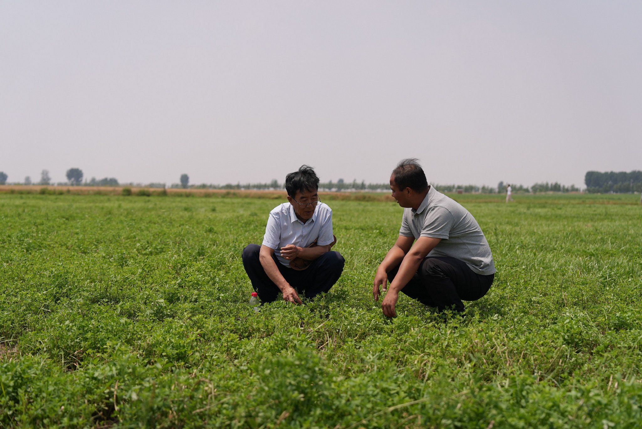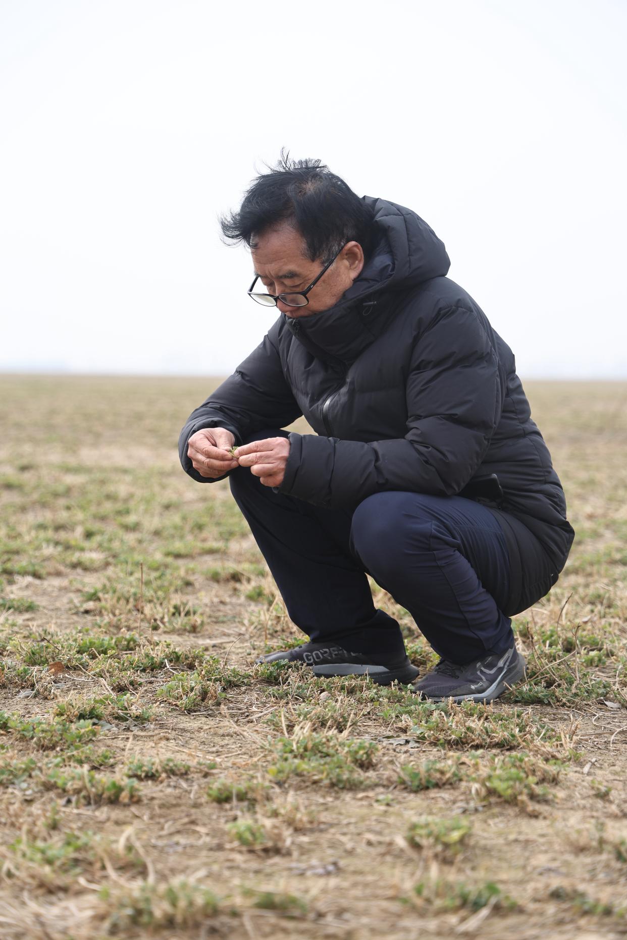 2月10日,他又来到兰考县杨庄,蹲下来查看苜蓿的生长情况。这个冬天气候偏暖,苜蓿的长势很好。再过一个多月,这里将成为一片绿色的海洋。