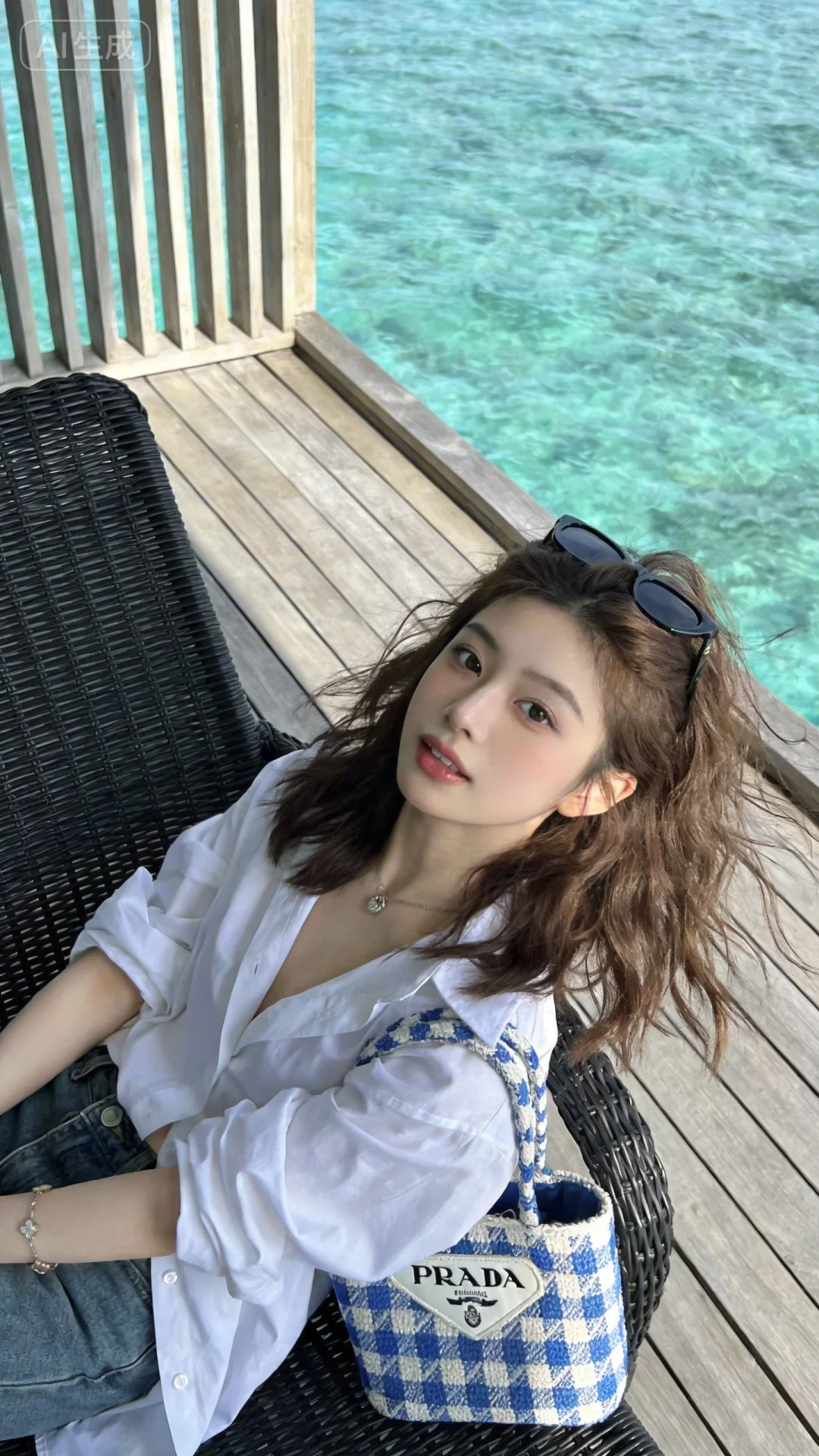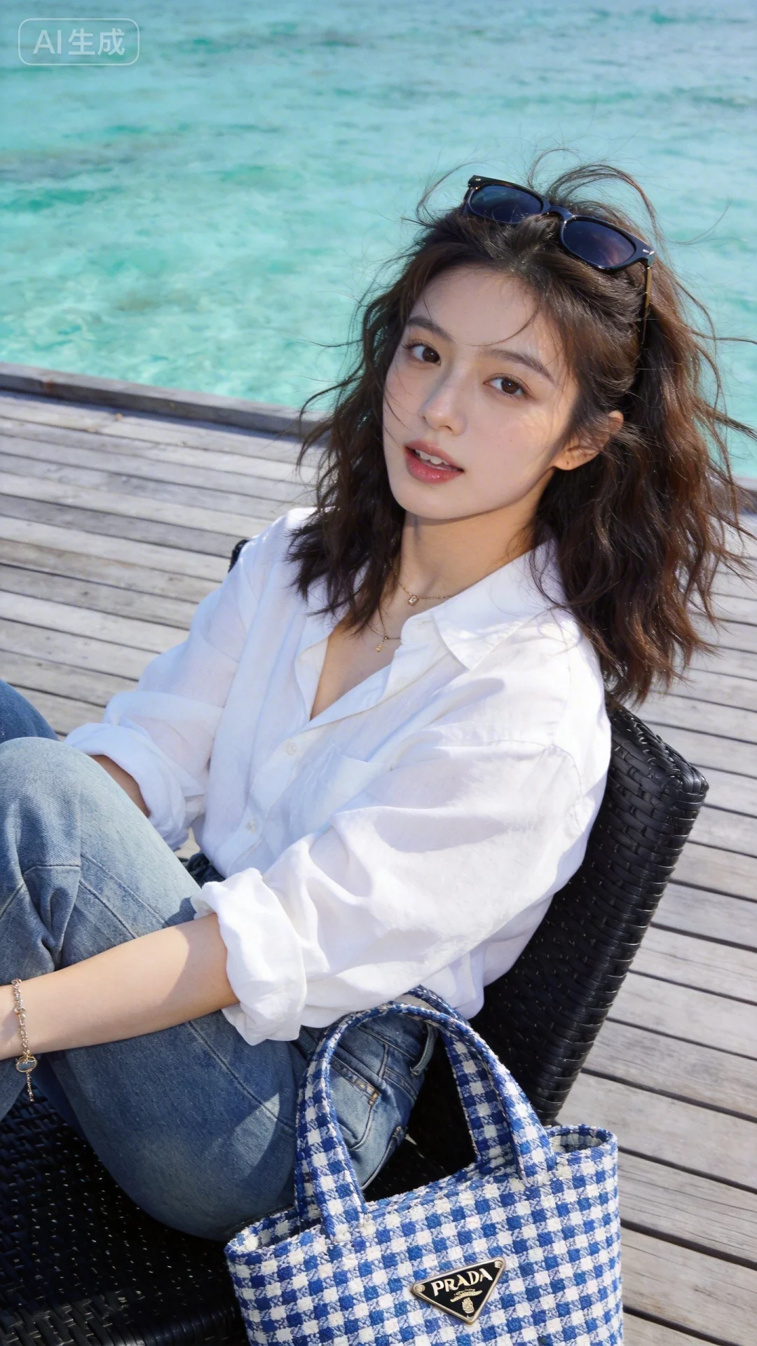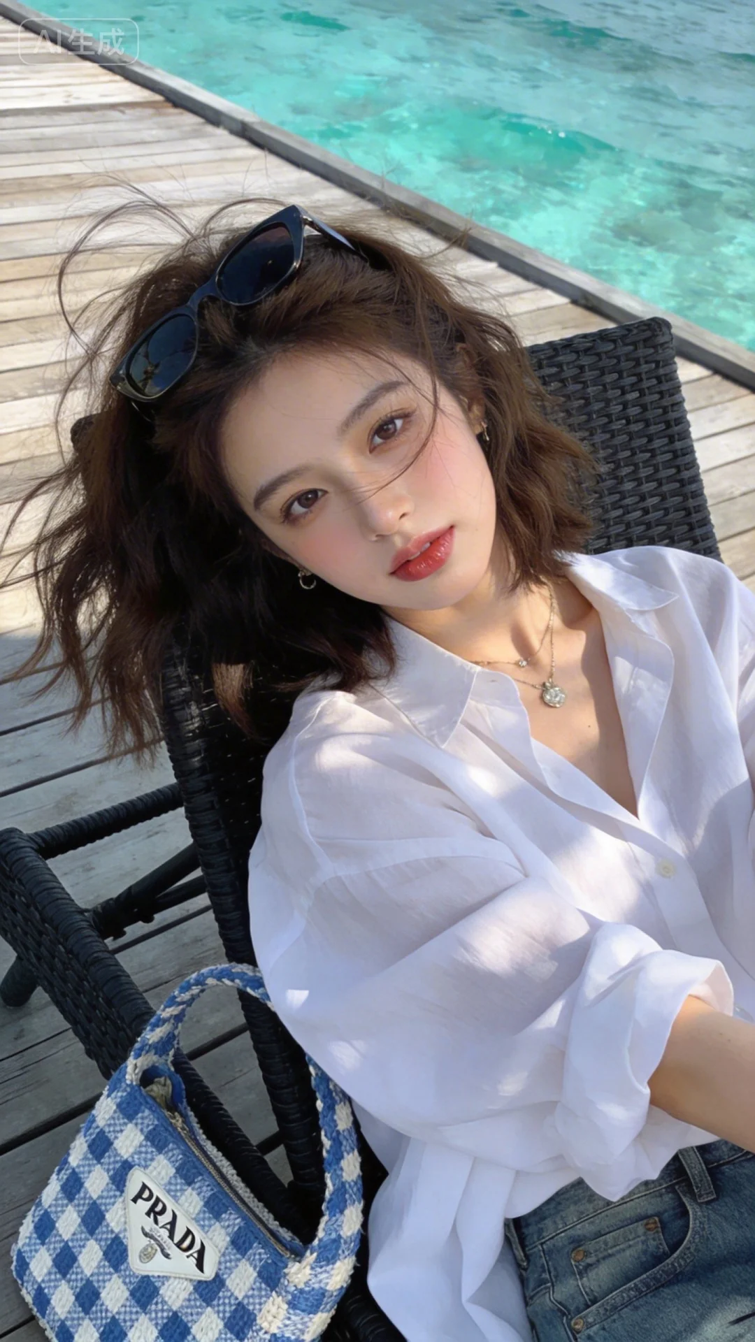 真实摄影,亚洲美少女,棕色蓬松中长发,头顶架着墨镜,穿着白色宽松衬衫,牛仔裤;坐在黑色藤编椅上,身旁放着蓝白格纹Prada编织手提包;背景是木质露台与清澈蓝绿色的海面,整体风格休闲度假风,充满夏日海边的清新与慵懒氛围,倾斜构图,(电影级面光:1.6),(光线追踪:1.5),(冷白皮漫感质感的光滑皮肤:1.7),(人物有最好的骨相:1.2),(网感脸:1.6),(网感妆:1.6)身材完美,莫兰迪配色,高颜值网红,INS风,幼态脸,19岁女生尖下巴,三庭五眼比例均衡,身材娇小,细腻陶瓷水嫩肌肤,偏冷白皮,随机的妆容,随机的饰品,随机的动作,侧光,发丝轻飘,凌乱,随机角度拍摄,总体有很多的不确定性,但又好看,