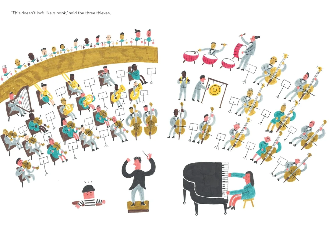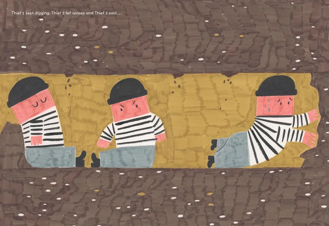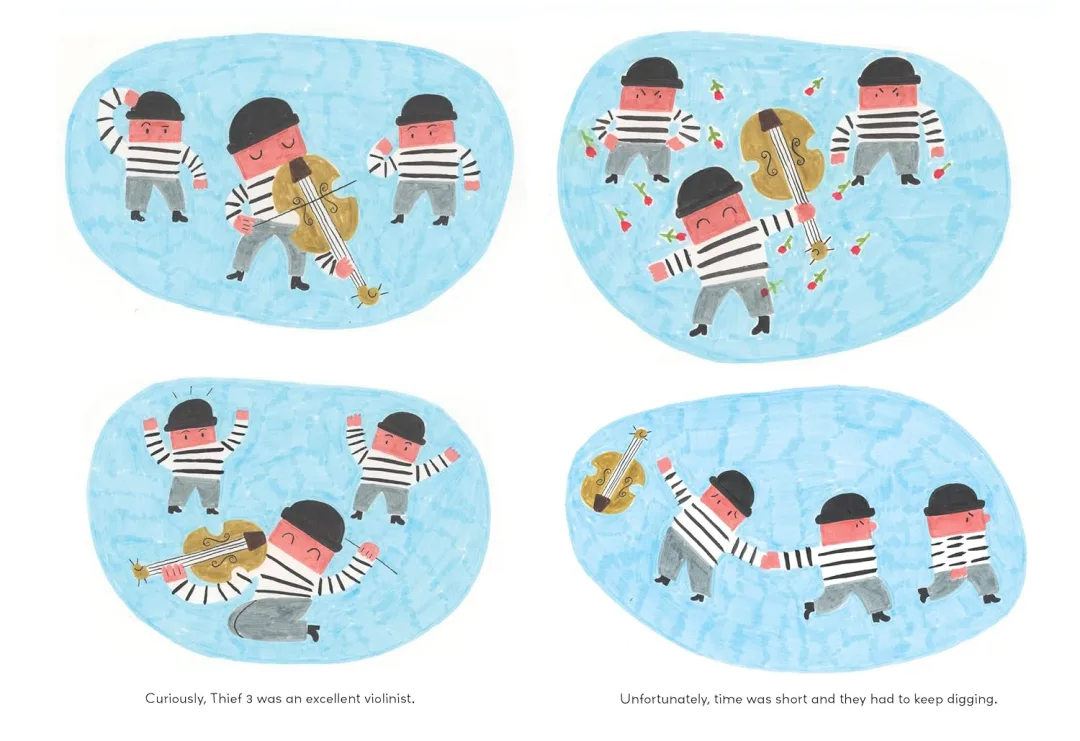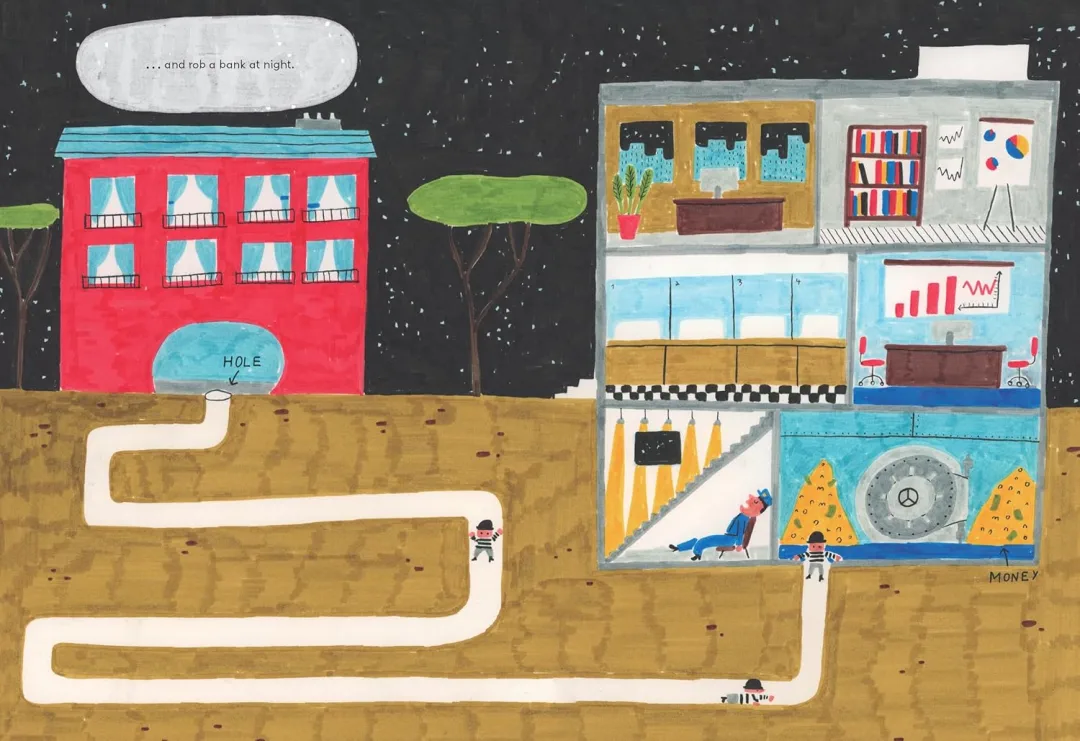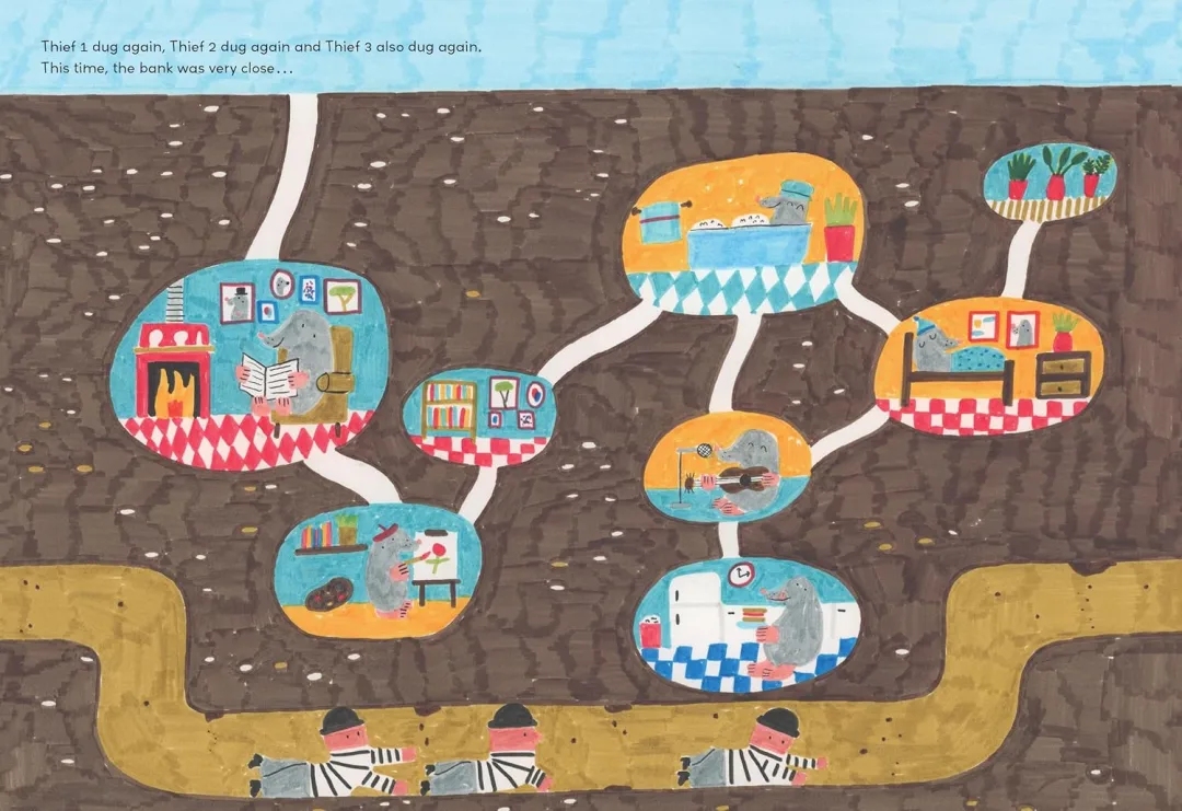 荒诞幽默的故事情节:书中充满滑稽的情境,三个小偷试图挖地道闯入银行的情节荒诞又有趣,非常适合孩子阅读或亲子共读。