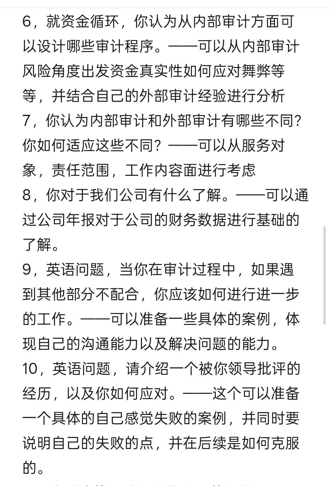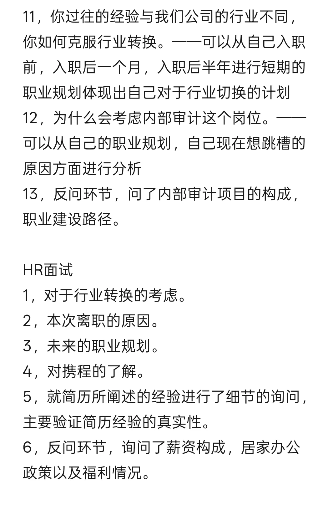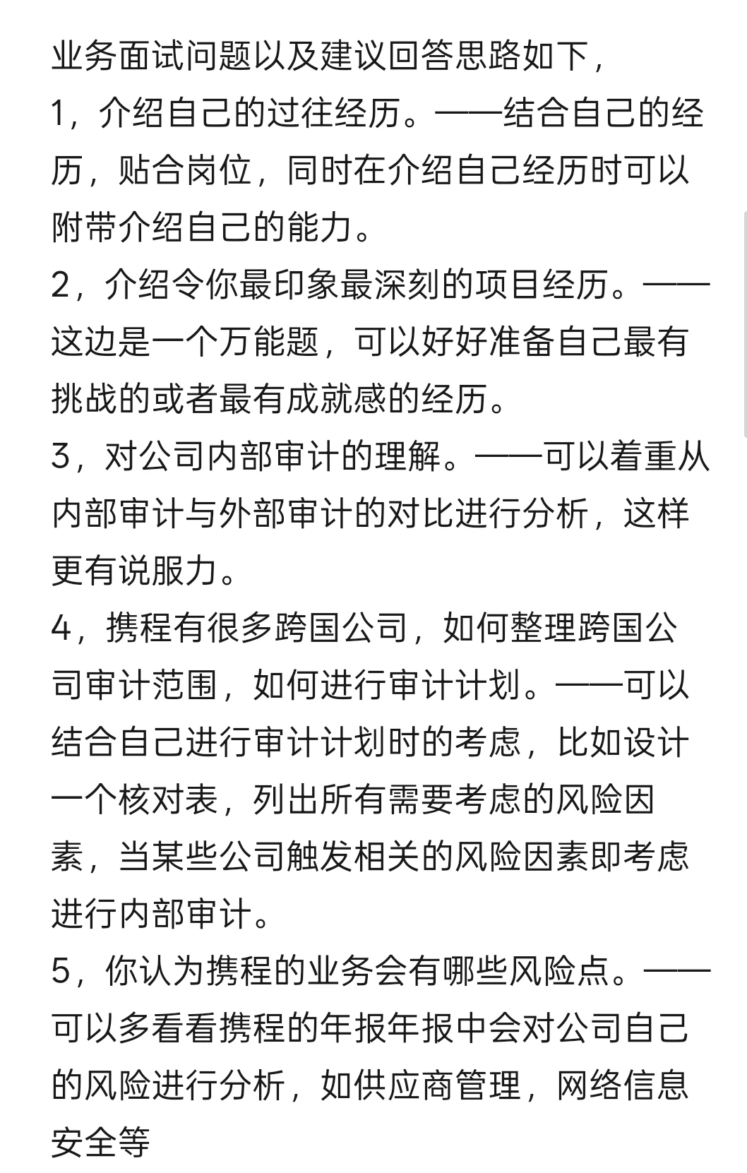 4,携程有很多跨国公司,如何整理跨国公司审计范围,如何进行审计计划。——可以结合自己进行审计计划时的考虑,比如设计一个核对表,列出所有需要考虑的风险因素,当某些公司触发相关的风险因素即考虑进行内部审计。