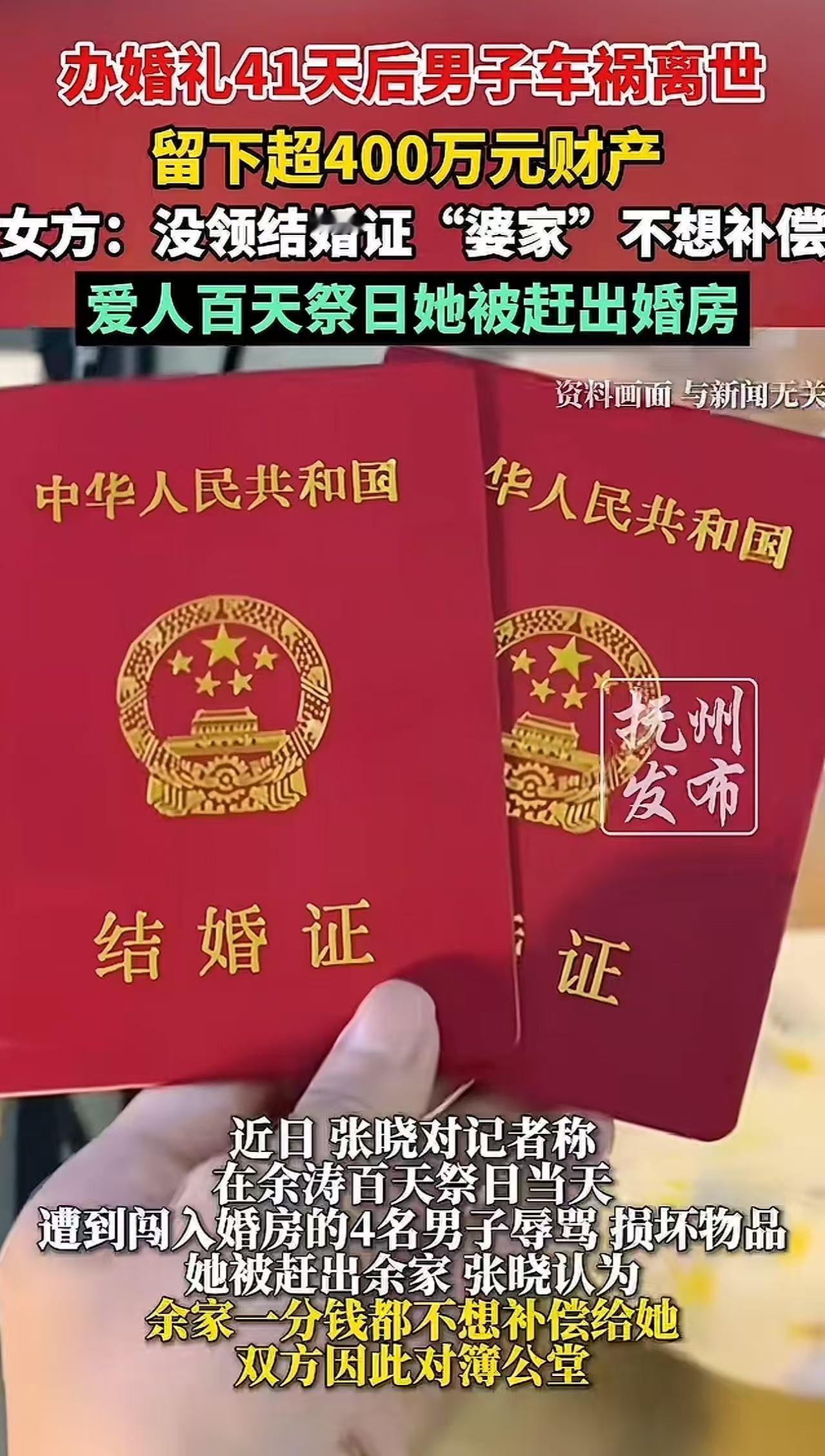 “这就是人性!”山西朔州,31岁女子和老公结婚后发生了夫妻关系,但没领证,41天后,老公车祸死亡,女子以妻子身份端灵,抱骨灰盒,打砂锅,不料,男子400万遗产全被婆婆拿走,女子一分没有拿到! 这件事说起来真的让人心里不是滋味,发生在山西朔州,主角是31岁的张晓和她的老公余涛。 两人之前已经在北京一起生活了一年多,感情一直不错,工资放在一起花,余涛的证券账户也是张晓帮忙管着,太原还有一套一百多平的婚房,首付41万,每个月五千的月供,每一笔钱都是两个人一起辛辛苦苦挣来的。 他们本来定好了2025年5月20号去民政局领证,可偏偏那天余涛拿到了新公司的入职通知,这年头一份好工作太不容易了,余涛舍不得请假,张晓也觉得反正酒席都办了,全村人都认可他们是夫妻,领证的事晚几天也没关系,没成想,这一拖就拖出了无法挽回的遗憾。 距离原定领证的日子刚过22天,也就是6月11号早上,余涛骑摩托车去上班,意外被一辆大货车撞飞,紧急送进ICU抢救,张晓在ICU门外守了7天,签了无数张病危通知书,终究没能留住余涛,6月18号,余涛还是走了,这时候,他们在一起的“婚姻”,才仅仅41天。 按照朔州当地的老规矩,葬礼上有个“打砂锅”的仪式,只有正室妻子才有资格做,张晓披麻戴孝,抱着余涛的骨灰盒,在全村人的注视下完成了这个仪式,全程以余涛妻子的身份端灵、送终,余家人当时也默许了,毕竟在熟人村里,一场体面的葬礼,不能没有儿媳妇撑场面,这既是给死人尽孝,也是给活人挣面子。 可谁能想到,丧事刚办完,灵堂还没拆干净,余涛的妈妈就彻底变了脸。 余涛留下的遗产不算少,有100万的意外险理赔、168万的车祸赔偿,再加上工亡补助和那套婚房,总共差不多有400万。 婆婆二话不说,直接拿走了余涛的手机,把里面所有账户的钱都转空了,所有的理赔金也全攥在了自己手里。 张晓去找婆婆理论,得到的却是一句冷酷又无解的话:你们没领证,在法律上你就是个外人,我是他亲妈,才是唯一的法定继承人。 要知道,余涛住院期间,张晓还垫付了7万多的医药费,葬礼上也尽了所有做妻子的责任,到最后却落得个净身出户的下场。 更让人寒心的是,余涛百日祭那天,婆婆竟然让包括余涛亲弟弟在内的4个壮汉,半夜闯进张晓和余涛的婚房,打砸一番,把墙上的婚纱照扯下来踩碎,还把张晓和她的父母连推带搡地赶了出去,分明就是想销毁两人一起生活的痕迹,假装这段关系从来没存在过。 后来,婆婆更是反过来把张晓告上了法庭,不仅一分遗产不给,还要求张晓退还49.7万元,说是之前给的彩礼、红包和五金,没领证就不算结婚,这些钱都是不当得利。 现在张晓也提起了反诉,要求分割两人同居期间的共同财产200多万,毕竟那些混着用的工资、一起还的房贷,都是她的血汗钱。 说到底,这事儿拼的不是情分,是法律,可最让人唏嘘的,还是人性的贪婪,用得着你的时候把你当家人,用不上了,就彻底翻脸不认人。 大家对此怎么看?欢迎评论区留下您的观点!