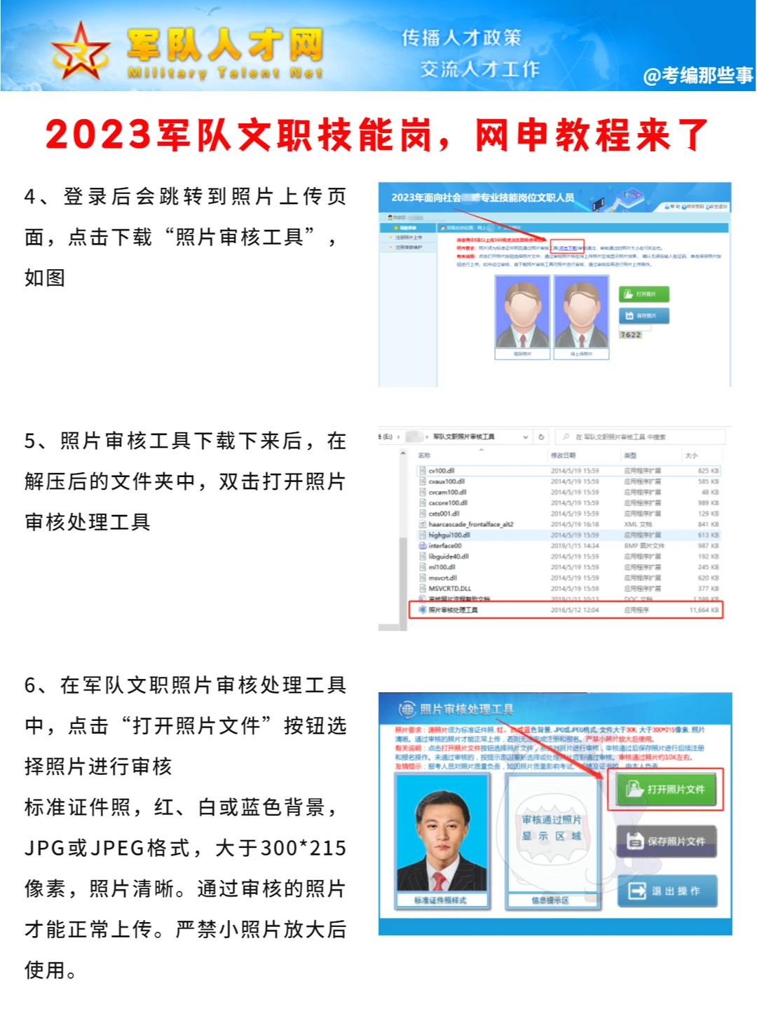 标准证件照,红、白或蓝色背景,JPG或JPEG格式,大于300*215像素,照片清晰。通过审核的照片才能正常上传。严禁小照片放大后使用。审核通过的照片下方会显示“审核通过,保存退出”,然后就可以点“保存照片文件”