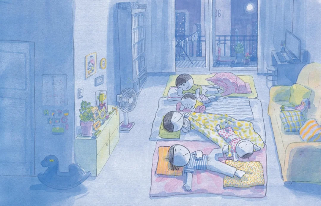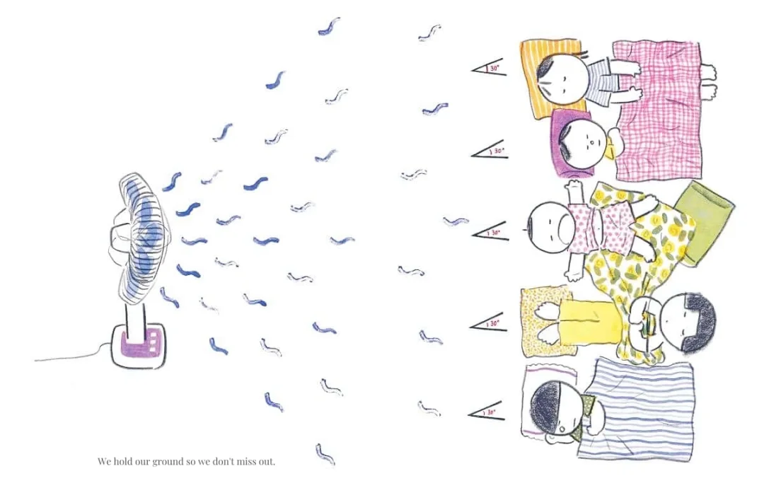 ——分享的方法太有趣,没想到还能这样分!1台电风扇吹出的风?大家并排睡就能每人平分30°,很公平!一双黄色雨靴?从老大、老二传到了老幺!