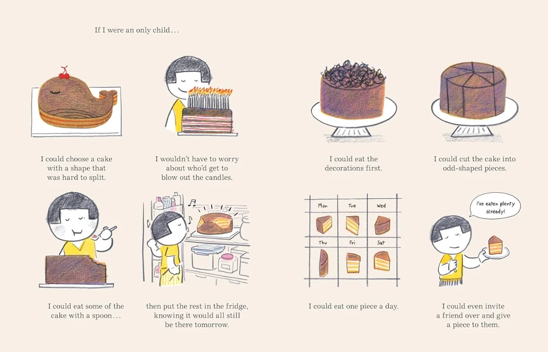 如果没有兄弟姐妹的话,我就能自己吃一整个蛋糕了。先吃哪一块都可以,一天内吃不完也没关系,放进冰箱里,第·二天打开还是原封不动。