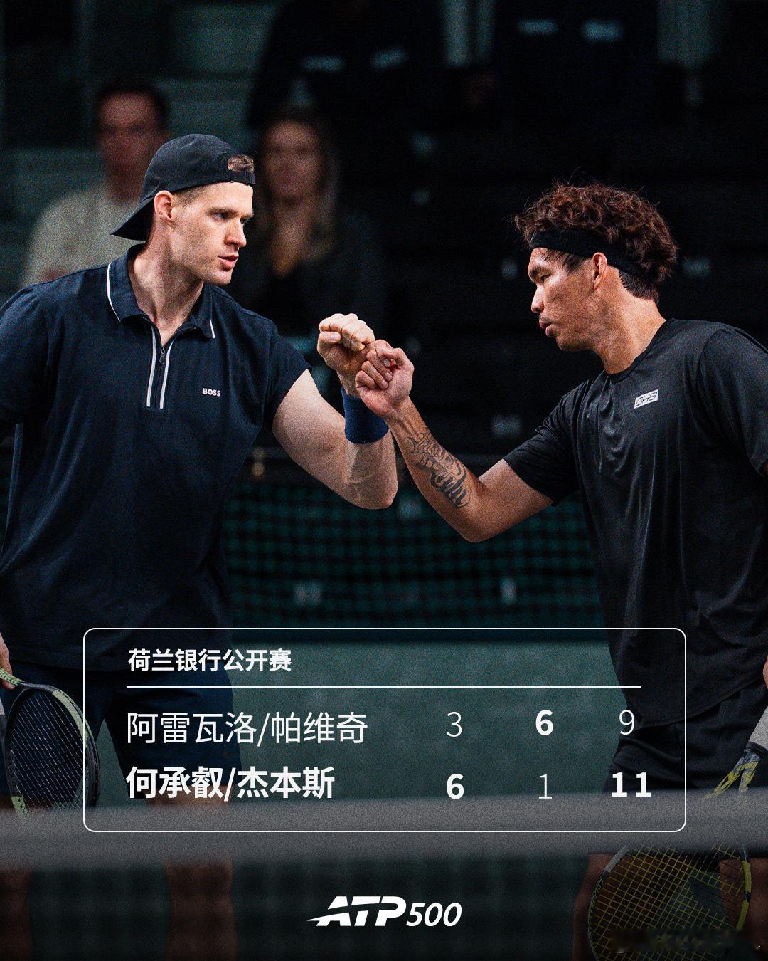 ATP500荷兰银行公开赛男双半决赛, 从资格赛突围的何承叡/杰本斯,以6-3 1-6 11-9击败头号种子阿雷瓦洛/帕维奇,率先闯入决赛!这也是何承叡首次闯入巡回赛男双决赛,恭喜🎉